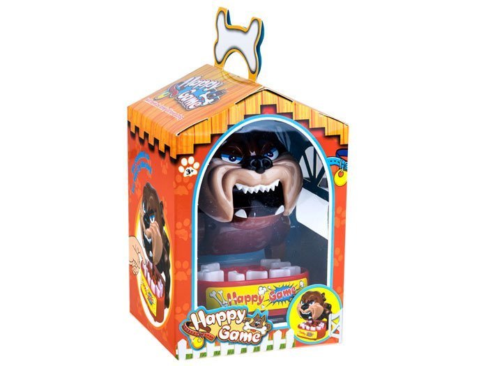 Vesela igra za male i velike, ali također možete individualno trenirati svoje reflekse.Ponovo ga povucite povlačenjem za leđa, tako da GLEDAJTE VAN !!! Igračka vrlo lijepo i lijepo izvedena. Ljubimac u smeđoj boji s bež njuškom, crvenom ogrlicom i zdjelom punom kostiju.