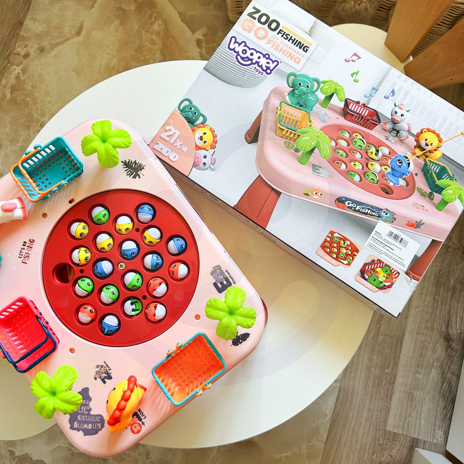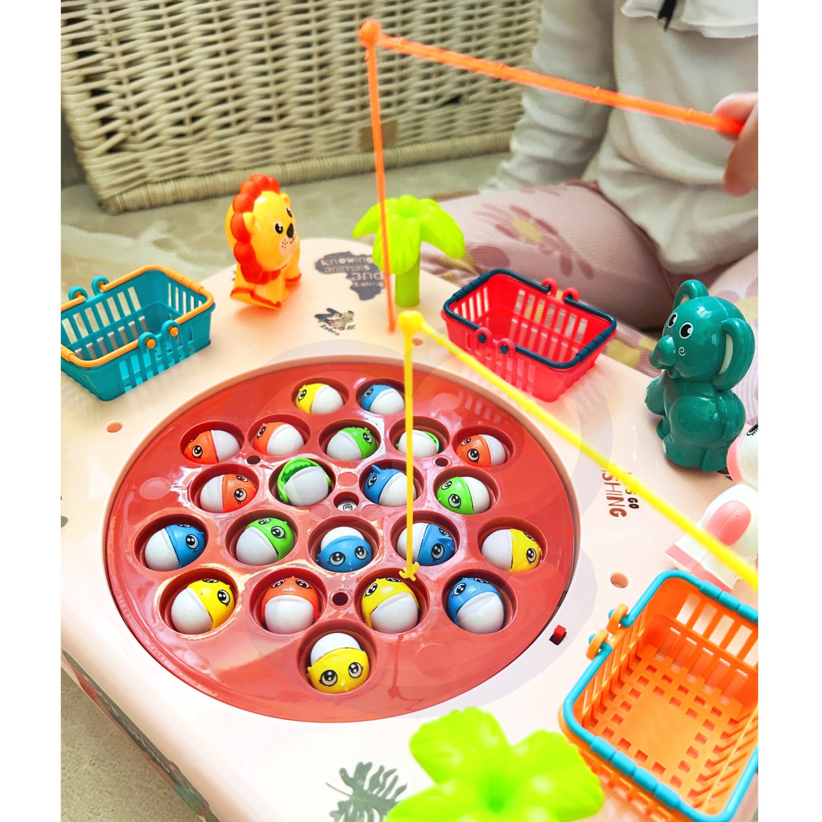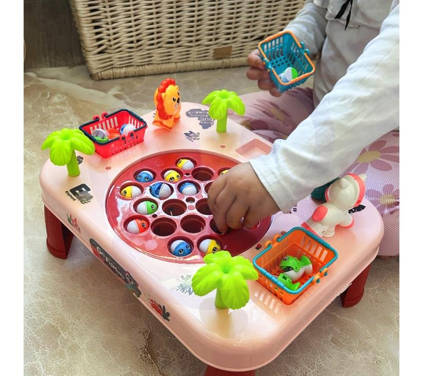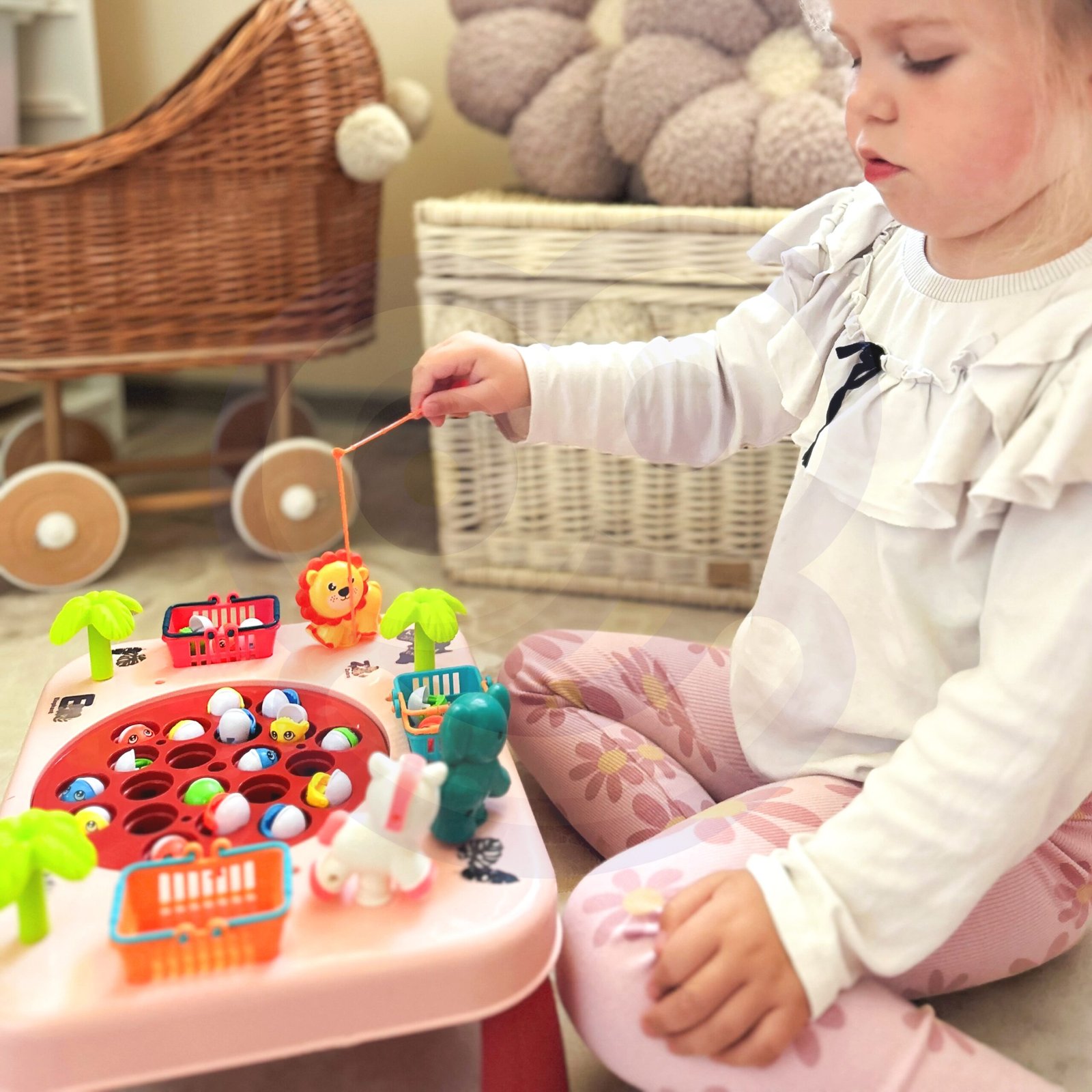 Ovaj jedinstveni stol je ulaz u beskrajnu zabavu za cijelu obitelj i prijatelje. Izrađen od čvrstog materijala, nije samo izdržljiv , već i estetski . Njegov šareni dizajn privlači pažnju i potiče vas na zajedničku igru. Košare postavljene sa strane stola nisu samo praktičan dodatak, već i element natjecanja. Sakupite što više riba, bacite ih u košare i pripremite se za brojanje bodova na kraju igre . Na bočnim stranama stola nalaze se i slatke životinjice koje su ugodne za oko. Da bi otežali ribolov, ploča s ribom na njoj se pomiče. Kako bi zabava bila što ugodnija, stol proizvodi melodiju i zvučne efekte!