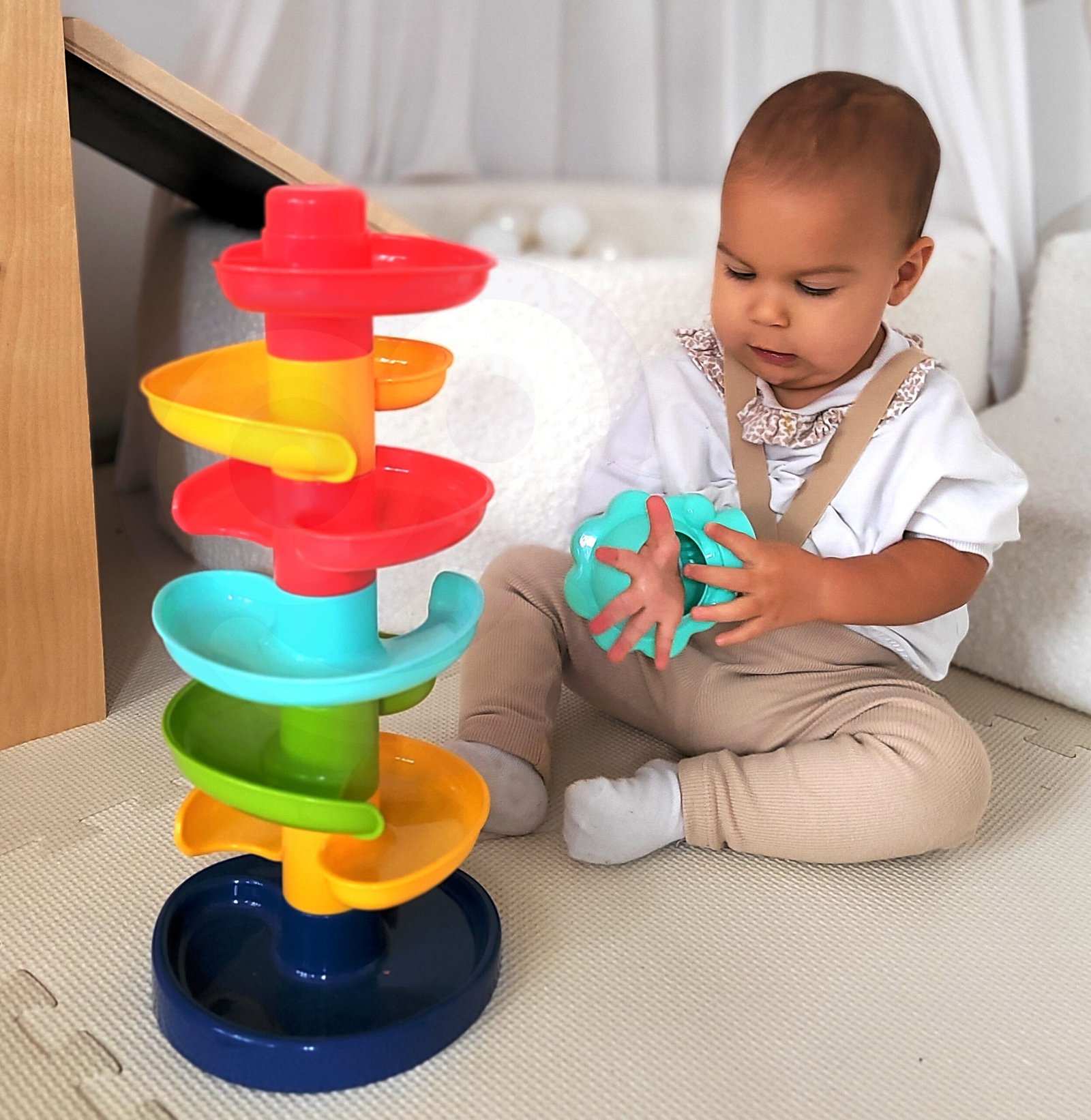 WOOPIE ‘s ball drop je spiralni toranj koji pruža beskrajnu zabavu. Ovaj set se sastoji od 8 šarenih dijelova koje vaš mališan može lako složiti jedan na drugi. Puštajte kuglice jednu po jednu s gornje razine i gledajte kako se kotrljaju jedna po jedna. Staza za loptice opremljena je s 2 lagane loptice različitih boja koje se lako drže i proizvode zvuk kada se pomaknu. Veličina je prikladna za male ruke i pomaže u razvoju koordinacije oko-ruka .