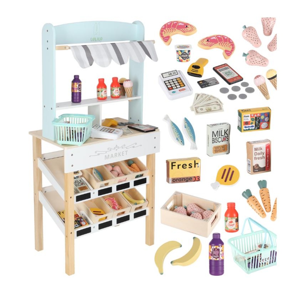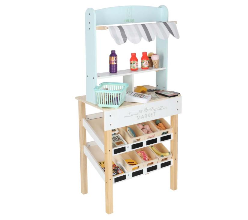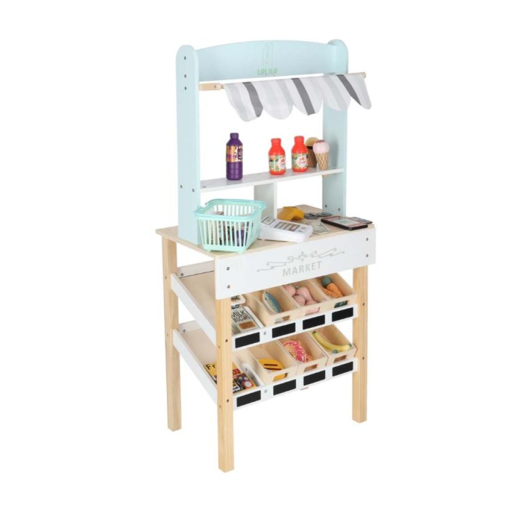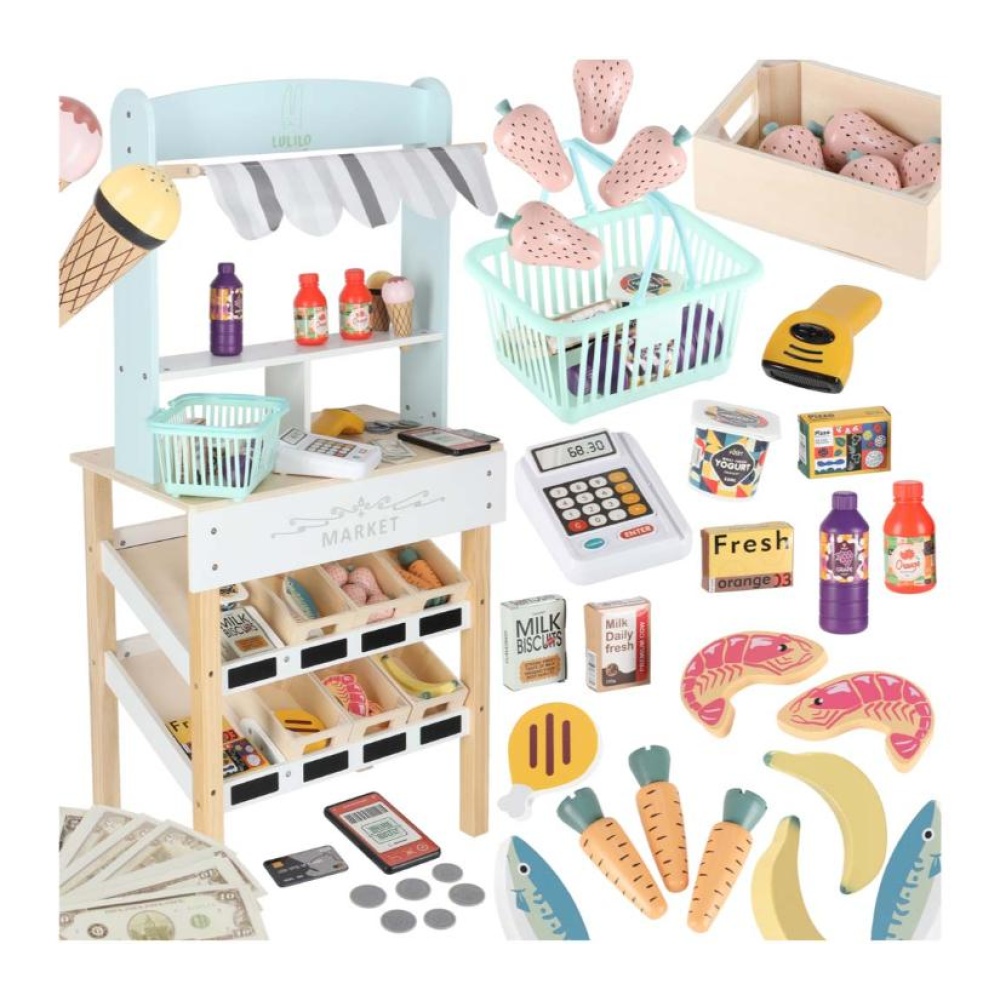 Trgovina igračkama  potiče djecu na igru ​​s raznim prehrambenim proizvodima. Štand se može sveobuhvatno opremiti popunjavanjem  polica i kutija  osnovnim proizvodima. Elementi seta su zanimljive  reprodukcije pravih prehrambenih proizvoda , poput  povrća i voćaribe i morskih plodovamliječnih  proizvoda ili  grickalica . Dijete može preuzeti ulogu trgovca koristeći interaktivni laserski skener barkodova. Tijekom kupovine,  skener proizvoda ispušta prepoznatljiv zvuk  kako bi potvrdio da je kod pročitan. Realistična  zabava kupovine razvija maštu , a igranje uloga omogućuje djetetu da se snađe u svijetu kupovine.