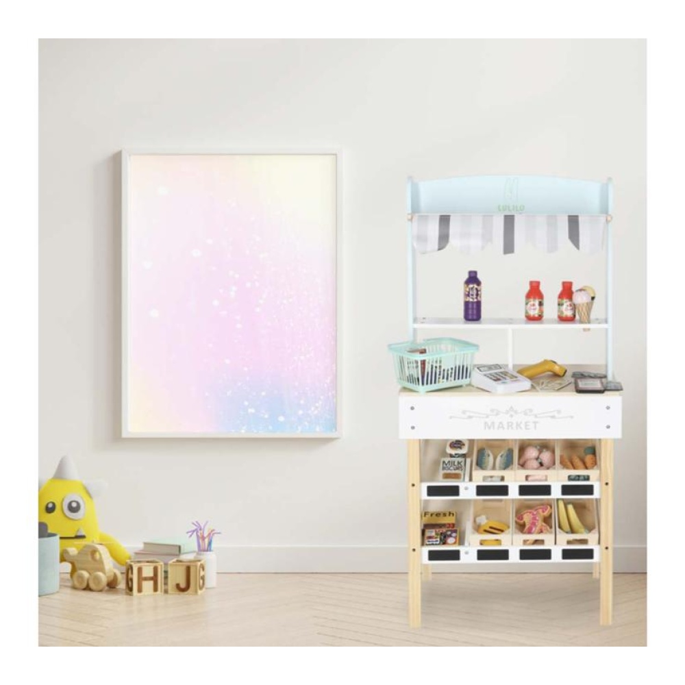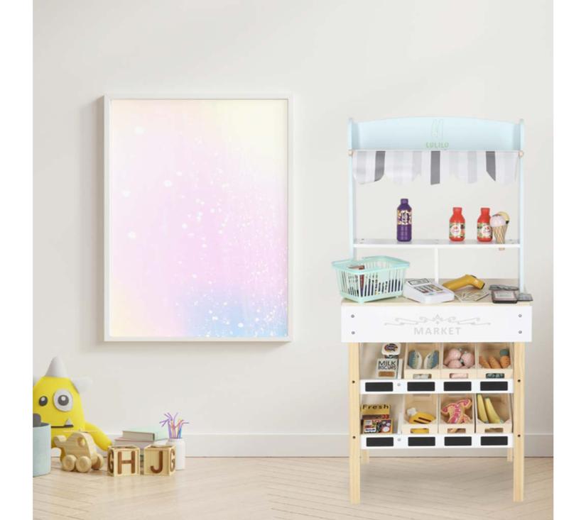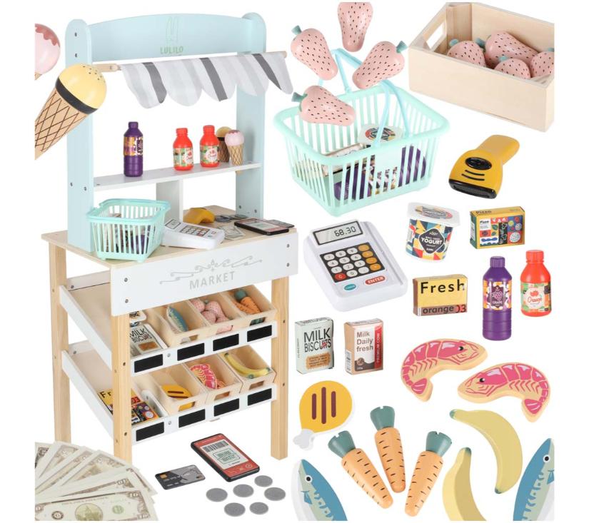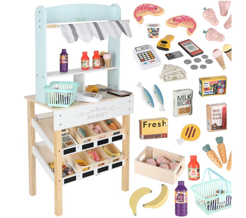 Trgovina igračkama  potiče djecu na igru ​​s raznim prehrambenim proizvodima. Štand se može sveobuhvatno opremiti popunjavanjem  polica i kutija  osnovnim proizvodima. Elementi seta su zanimljive  reprodukcije pravih prehrambenih proizvoda , poput  povrća i voćaribe i morskih plodovamliječnih  proizvoda ili  grickalica . Dijete može preuzeti ulogu trgovca koristeći interaktivni laserski skener barkodova. Tijekom kupovine,  skener proizvoda ispušta prepoznatljiv zvuk  kako bi potvrdio da je kod pročitan. Realistična  zabava kupovine razvija maštu , a igranje uloga omogućuje djetetu da se snađe u svijetu kupovine.