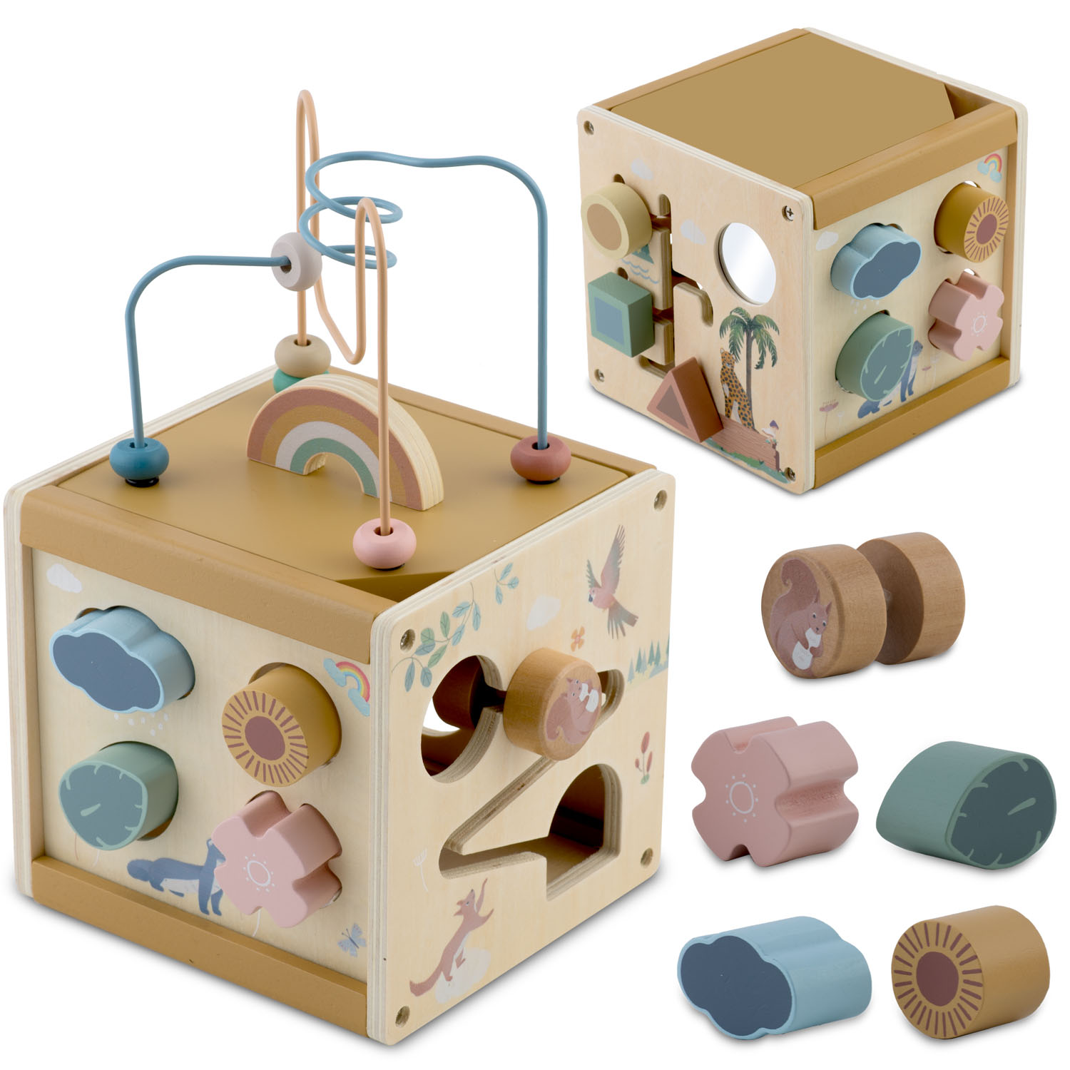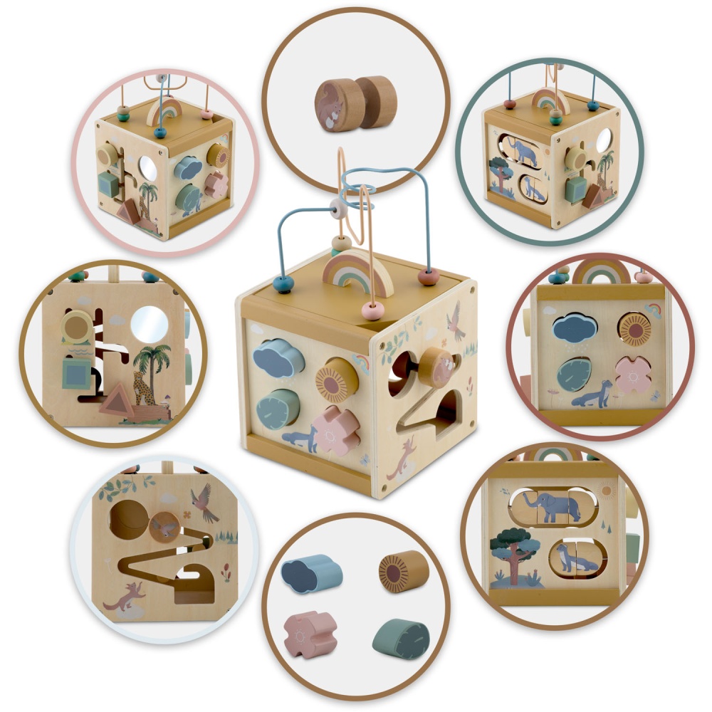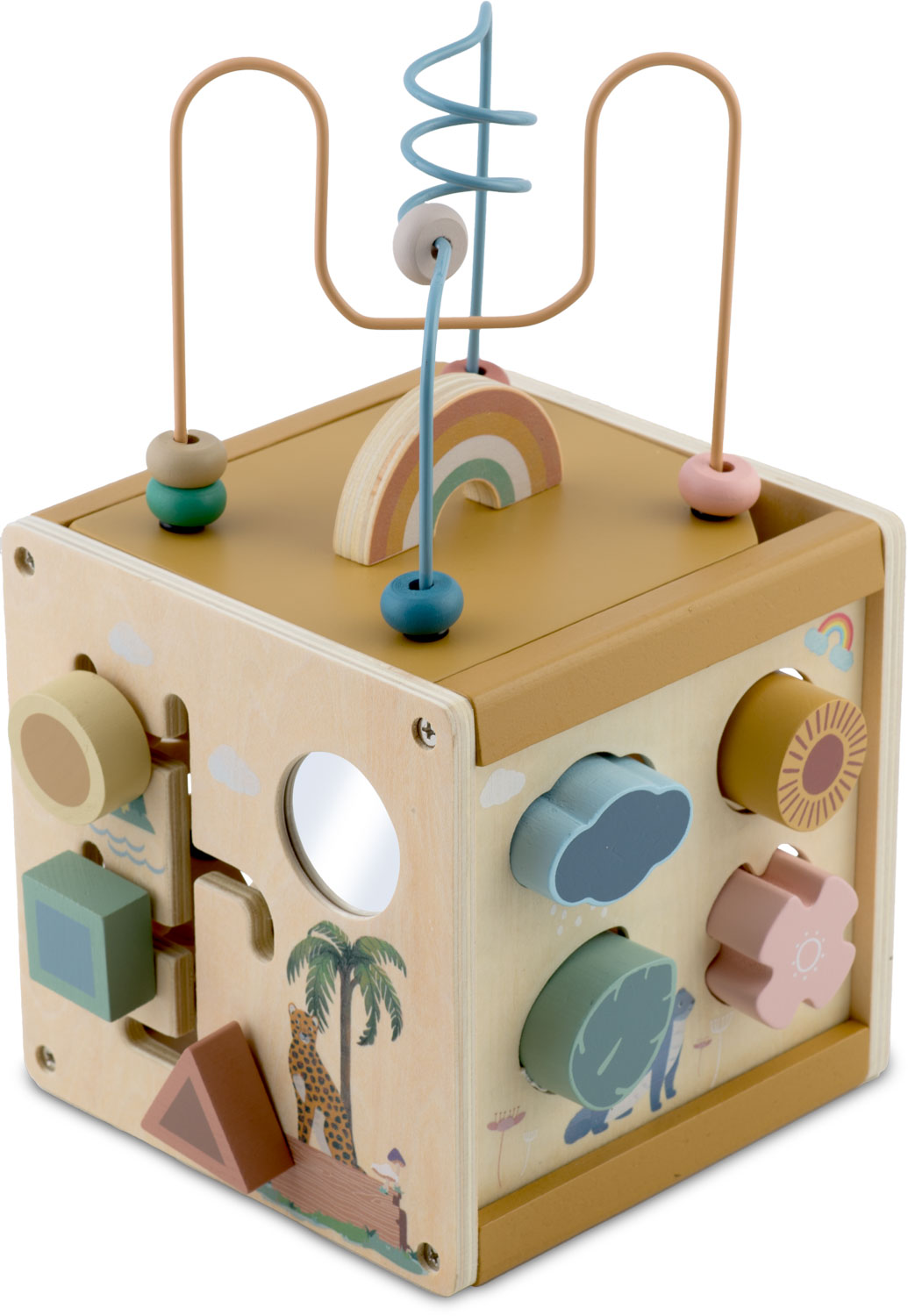 Kuglice koje strše u ovoj igrački mogu se sakriti unutar kocke, što olakšava spremanje i transport. Siguran je, estetski i omogućuje jednostavno upravljanje prostorom.