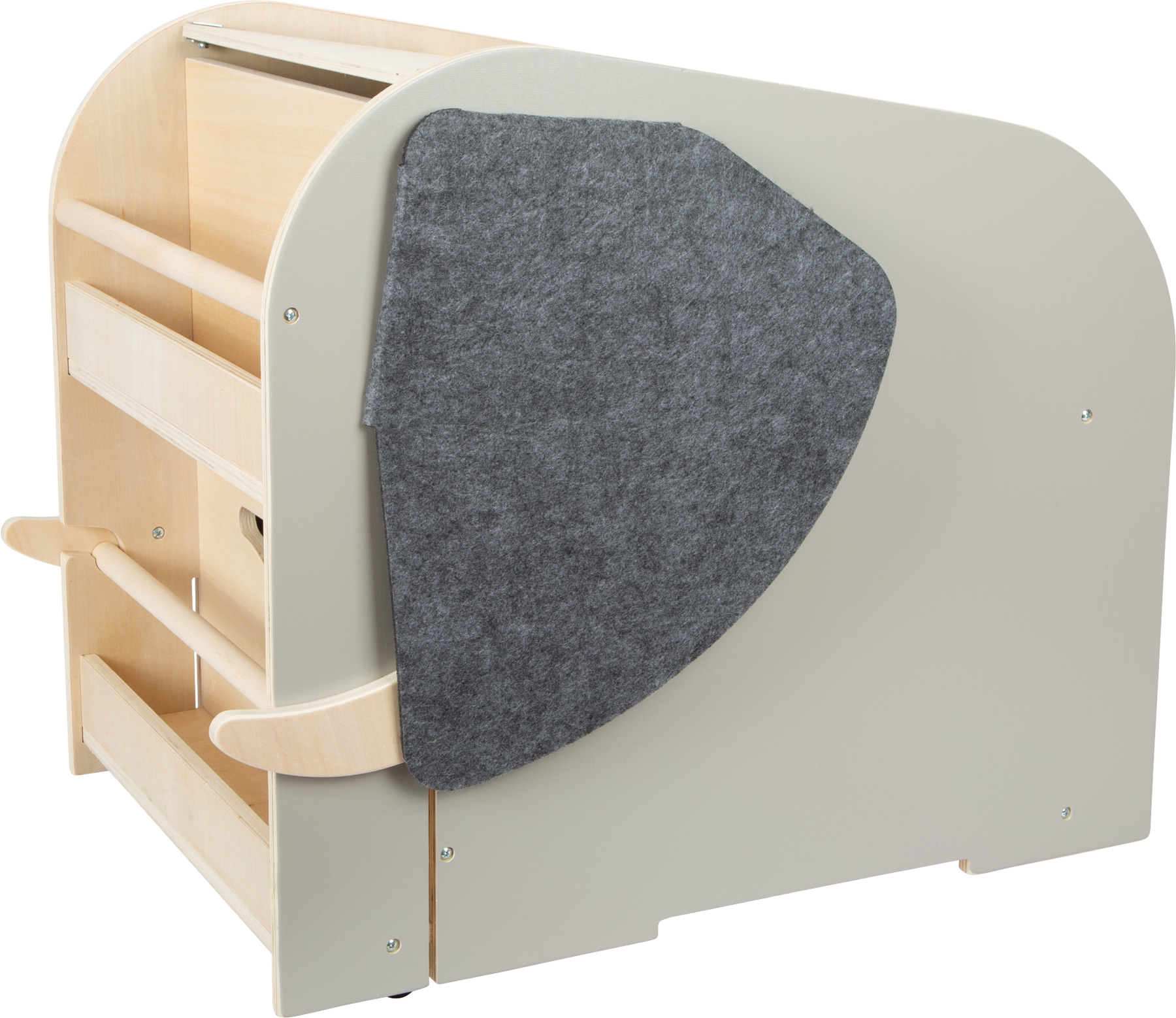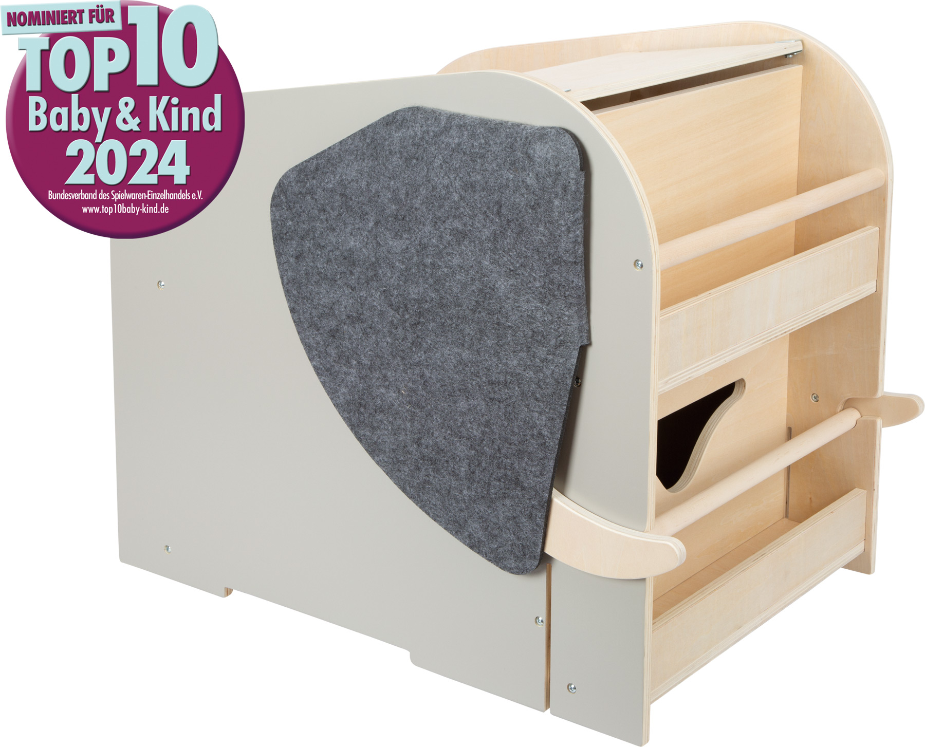 Toliko više od pukog “auuuu!” Sigurno, višenamjensko i ekološki održivo: ovo praktično rješenje za pohranu kombinira funkcionalnost s estetikom. Sa svojim prigušenim bojama, velikim ušima od filca i velikom količinom vidljivog drvenog materijala, ovaj se slon sjajno uklapa u svaki životni ambijent. Zahvaljujući skrivenim kotačićima od 360°, ovu kutiju za igračke možete lako gurati i povlačiti u bilo kojem smjeru. Integrirano sjedalo nudi mjesto za opuštanje i igru. Veliki prostor za odlaganje na dnu s preklopnim vratima može se koristiti za spremanje velikih igračaka. Prostoru za pohranu na vrhu može se pristupiti kroz preklopna vrata sa zaštitom od prignječenja.