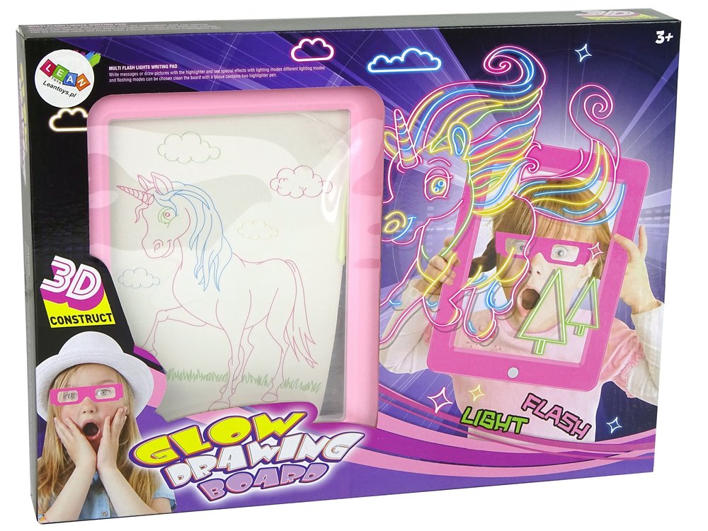 To je zabavan, svijetleći blok za crtanje koji će osvijetliti crtež vašeg djeteta. Jedinstveni zaslon je kristalno jasan, jednostavno pritisnite gumb da biste vidjeli kako crteži sjaje s višestrukim svjetlosnim efektima. Sljedeći korak je položiti odabrani list slika u boji i iscrtati oblike prema linijama fluorescentnim markerima.