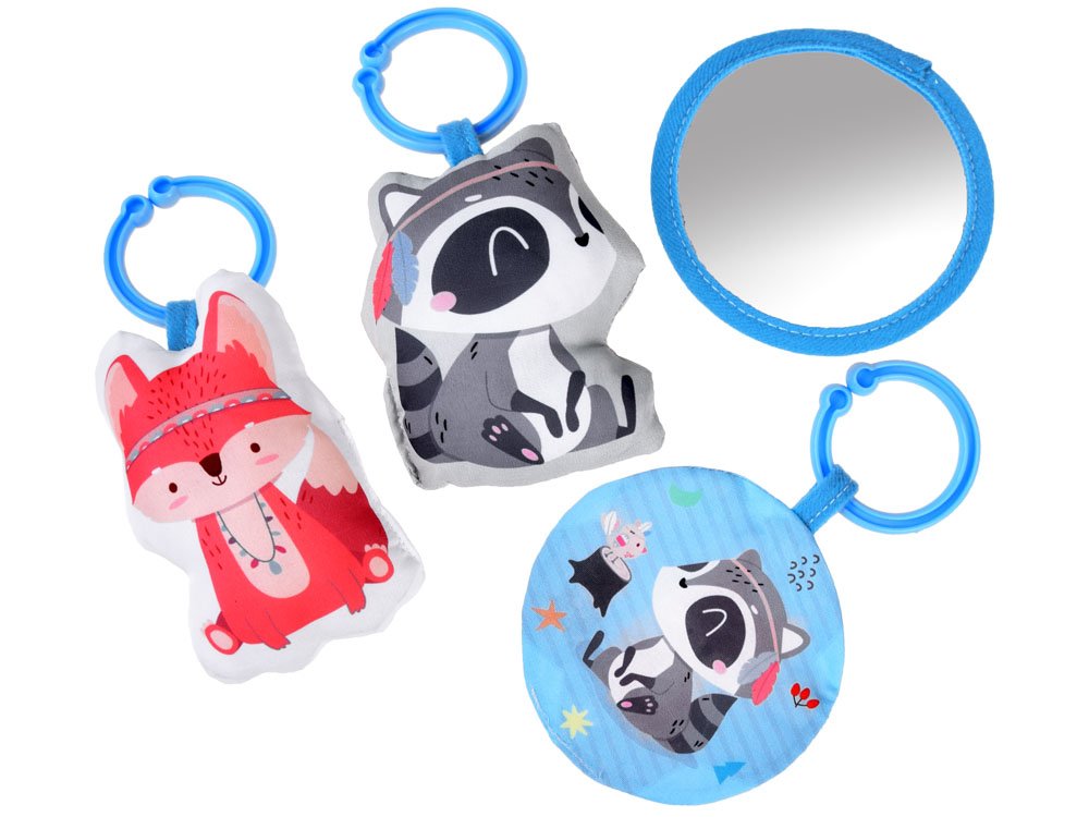 – 2 x mekane igračke od tkanine sa zvonom iznutra (crvena lisica, bijela, siva jazavac)