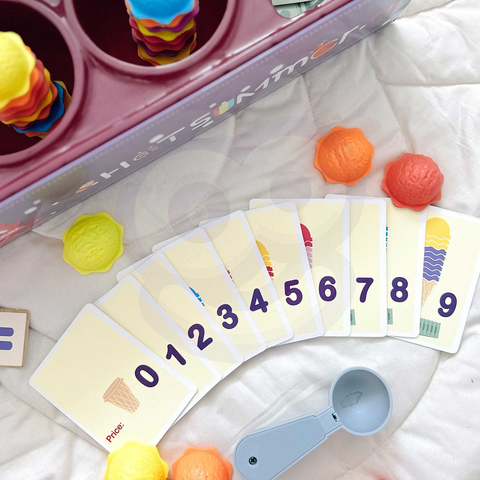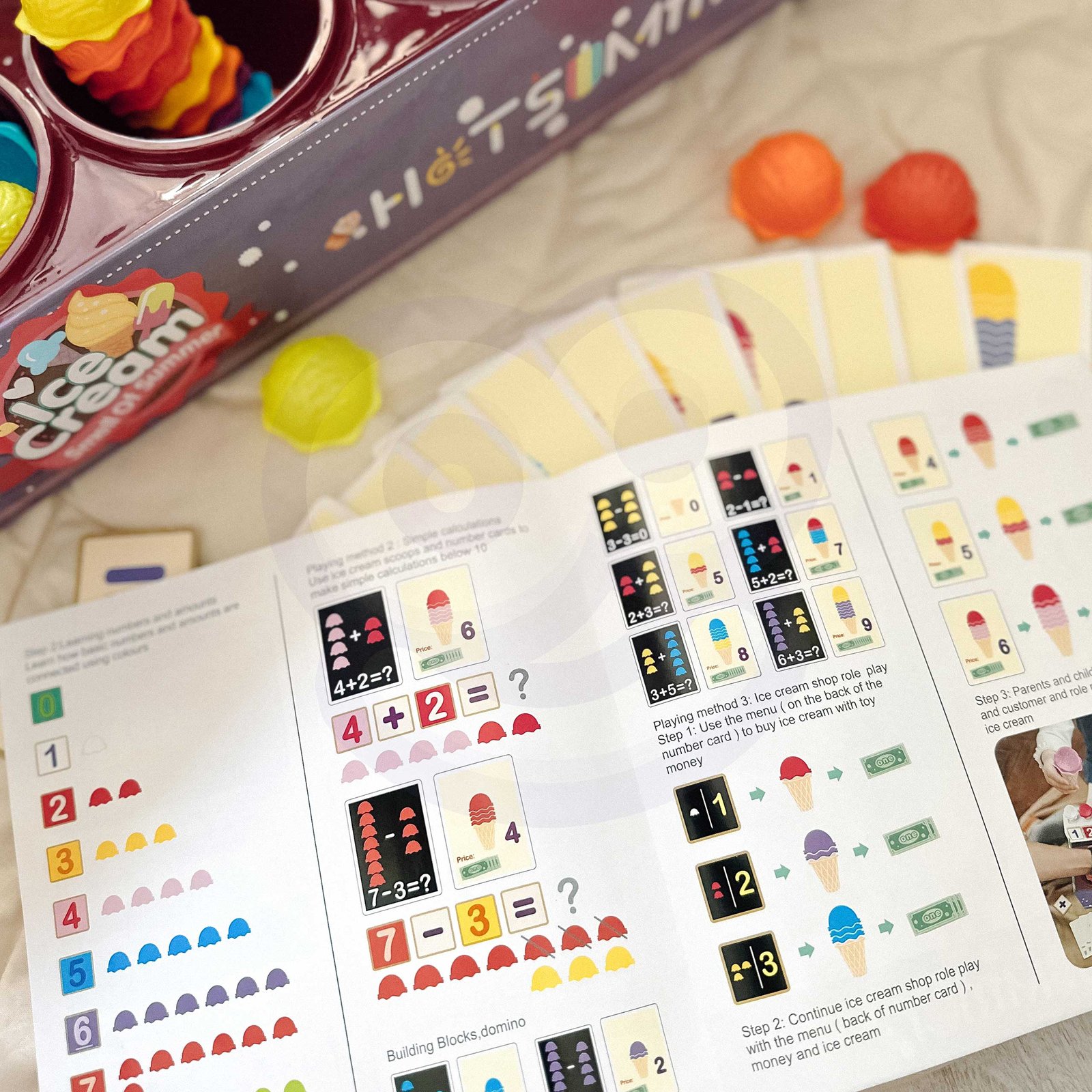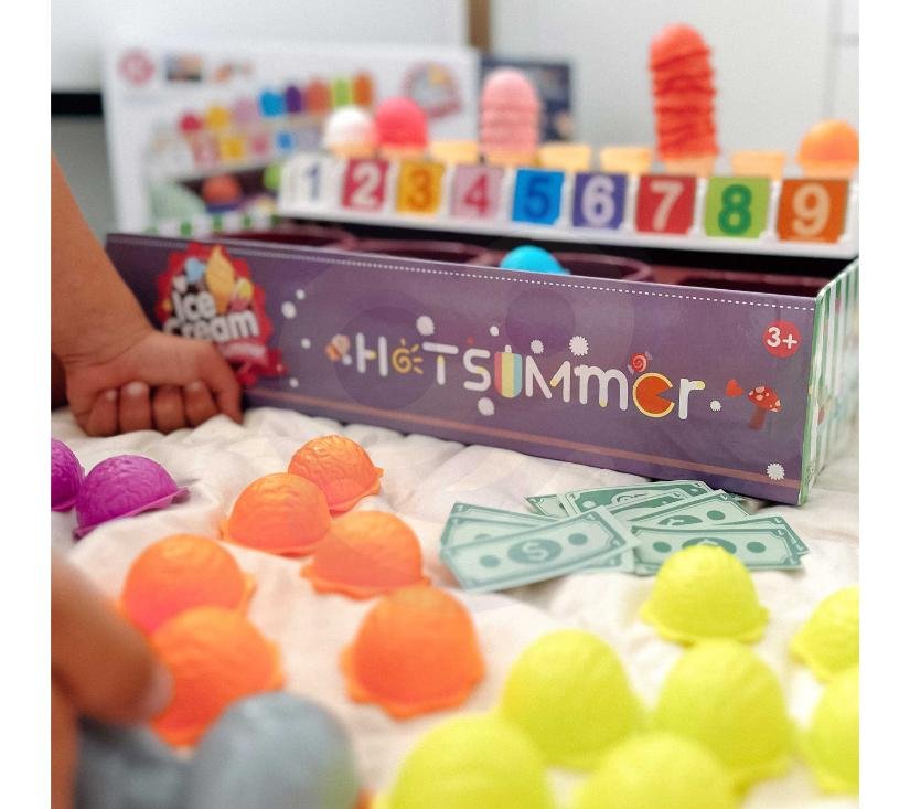Set Ice Cream Parlor brenda WOOPIE ne samo da će vam omogućiti da se igrate kao mali prodavač sladoleda, već će vam pomoći i u učenju brojanja, brojeva, boja i zbrajanja. Set uključuje 87 elemenata , uključujući kuglice za sladoled, napolitanke, kartice za narudžbe, novac, žetone s brojevima i žlicu za sladoled. Broj kuglica sladoleda varira ovisno o boji, a kartice s narudžbama sadrže jednostavne matematičke zadatke . Igrajući uloge, djeca razvijaju svoje komunikacijske vještine , pomažu smanjiti stres u svakodnevnim situacijama i pružaju izvrsnu lekciju o empatiji .