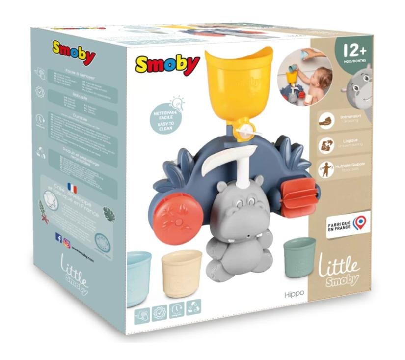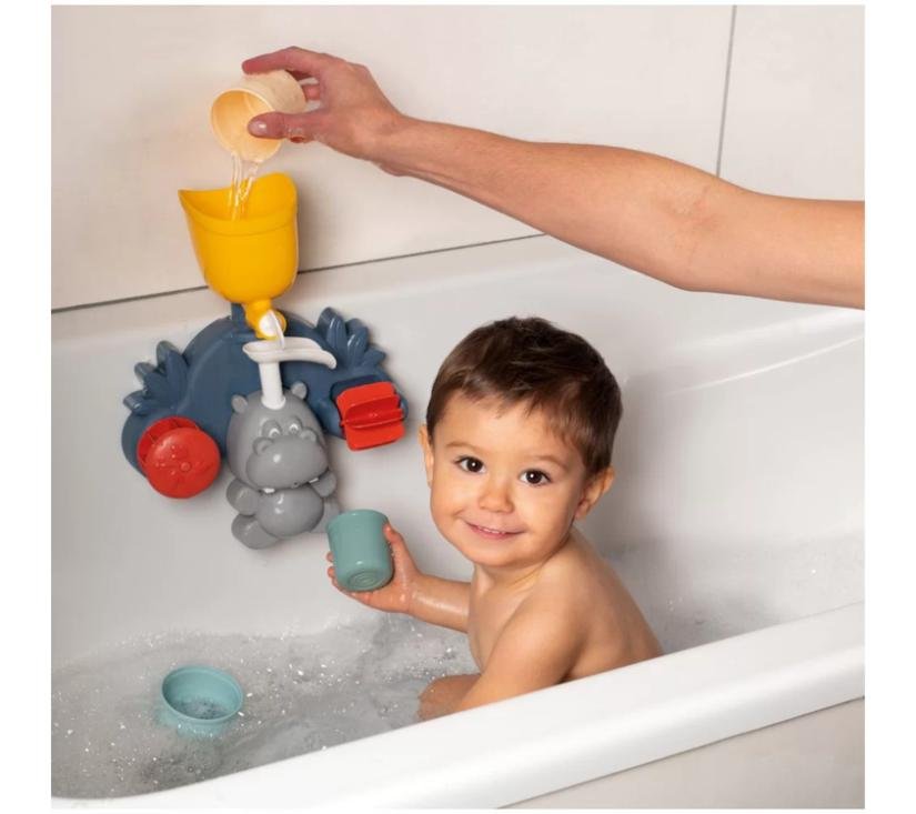 Ugodno kupanje vaše bebe postaje još dražesnije s igračkom za kupanje u obliku nilskog konja . Ova šarena naprava za montažu na zid kade ili pod tušem donosi čisti užitak tijekom večernje njege! Dijete može koristiti tri različite čaše da napuni žuti spremnik i usmjeri mlaz vode u jednom od tri smjera. Vaš mališan može gledati kako voda pokreće rotirajuće kotače. Ova interaktivna igra aktivira djetetovu motoriku. Igračka je savršeno prilagođena malim ručicama malih istraživača i zadovoljava sigurnosne standarde.