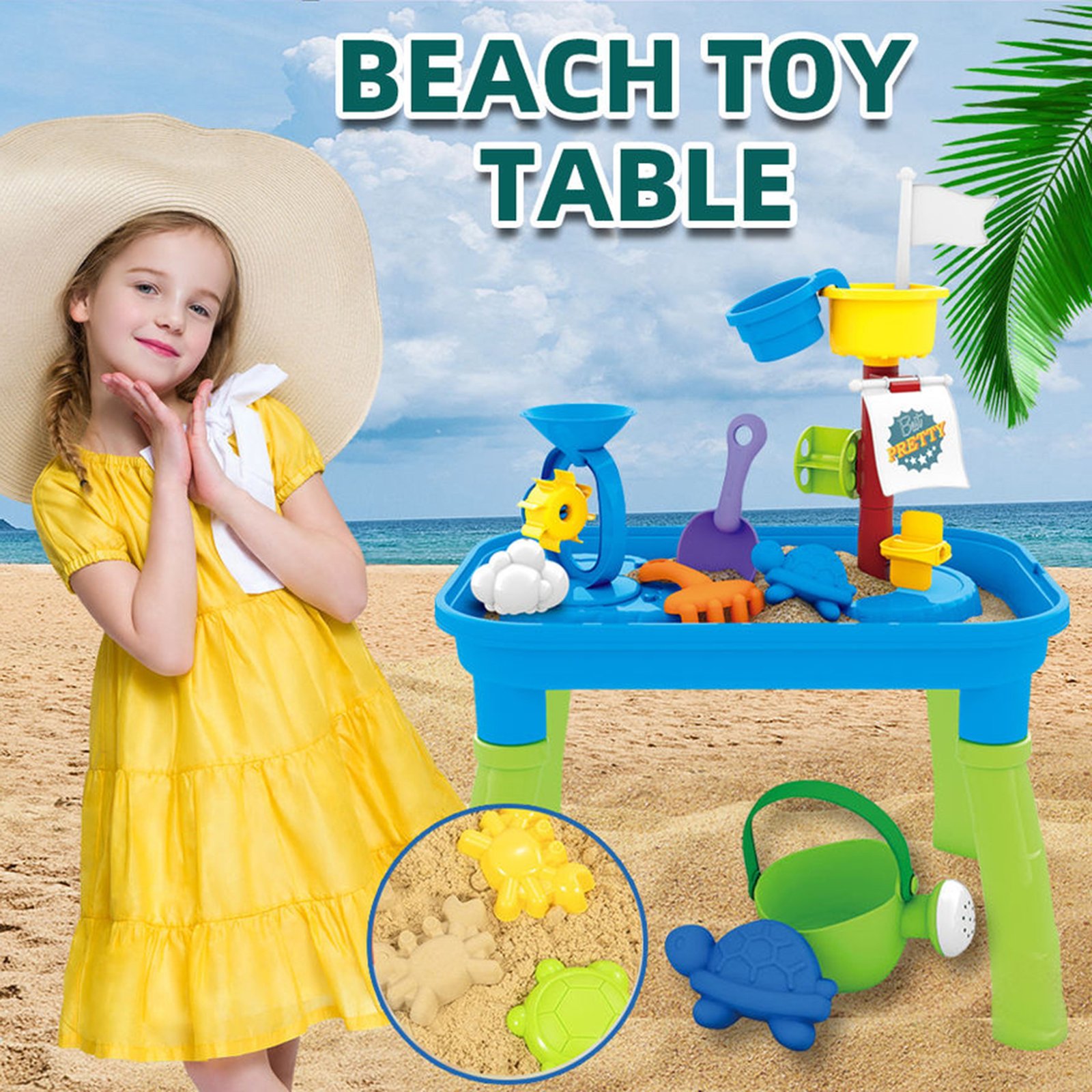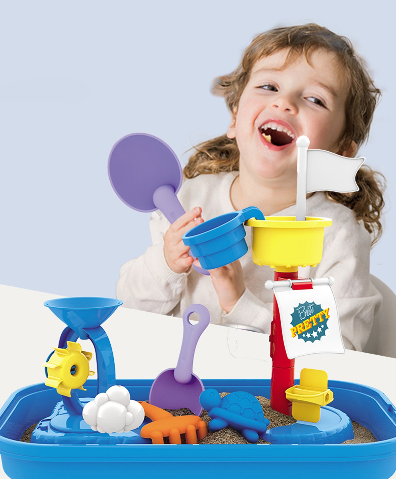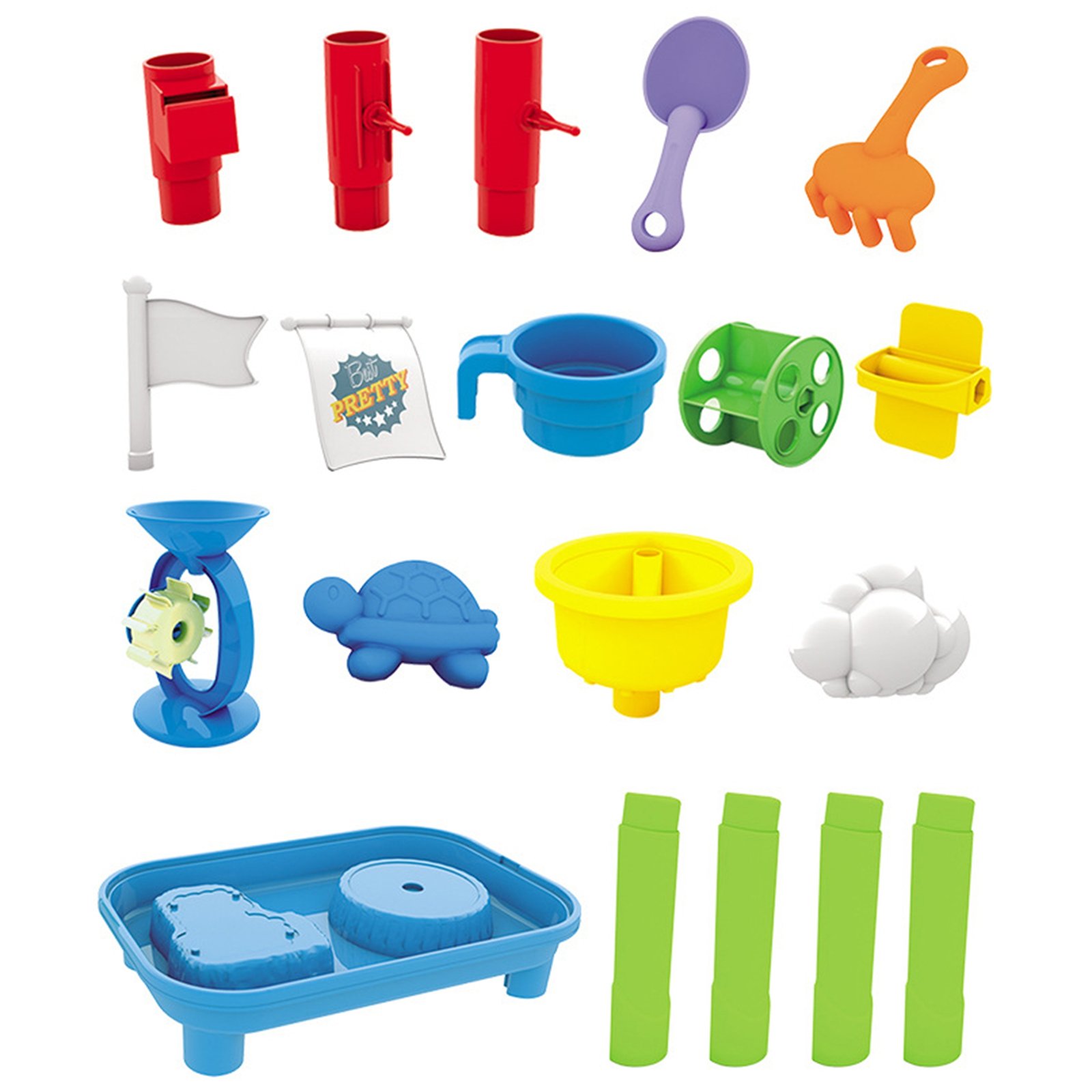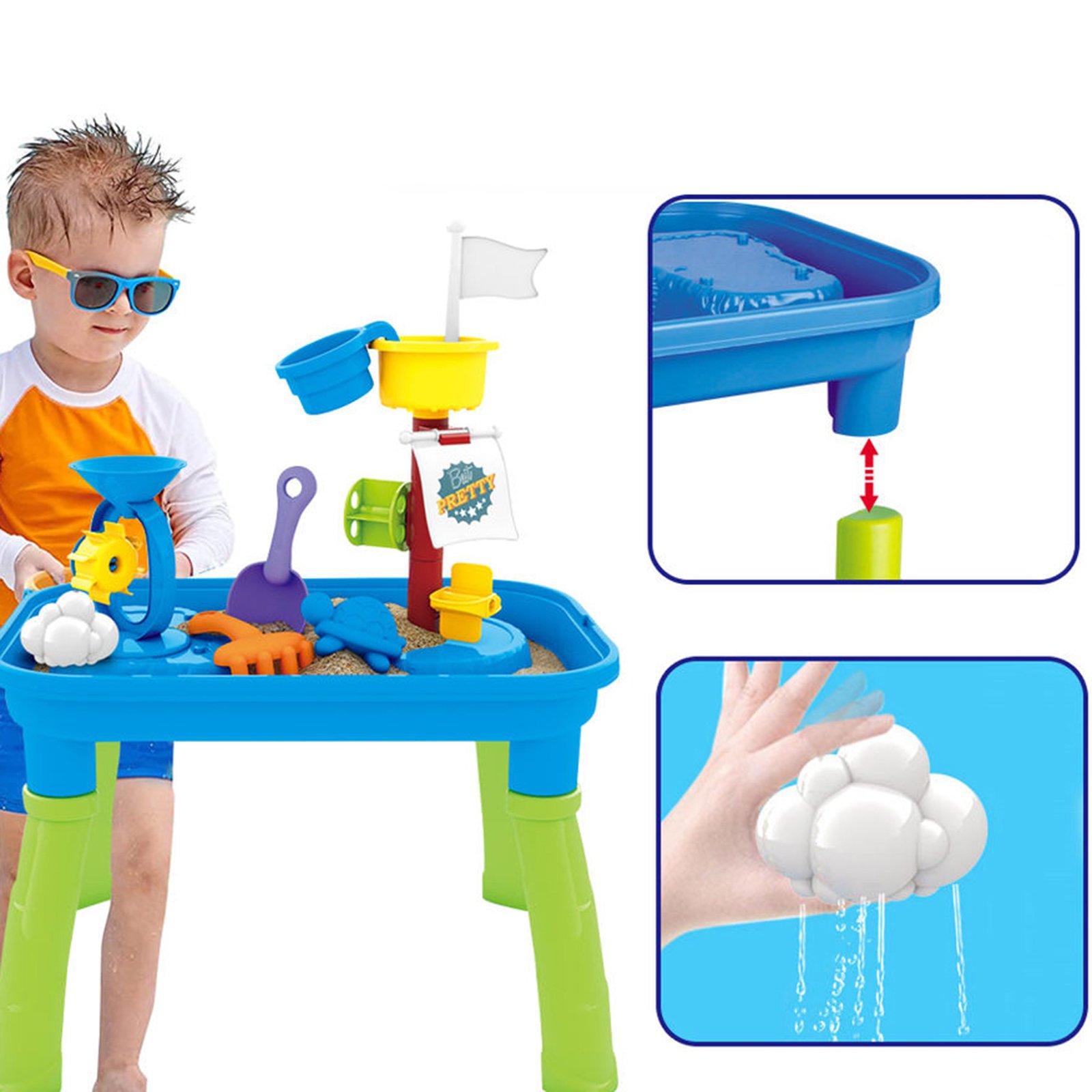 Stol marke WOOPIE idealna je igračka za igru s vodom i pijeskom . Set uključuje puno pribora za igru, uključujući kalupe, grablje, lopatu i mnoge druge. Pomoću šalice dijete može sipati vodu niz jarbol i vidjeti kako se voda kreće kroz vodenice. Stol je namijenjen za igru u kući i na otvorenom . Savršeno za igranje kod kuće i na plaži ili pješčaniku.