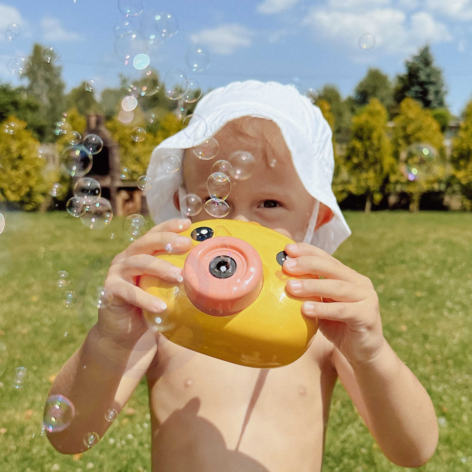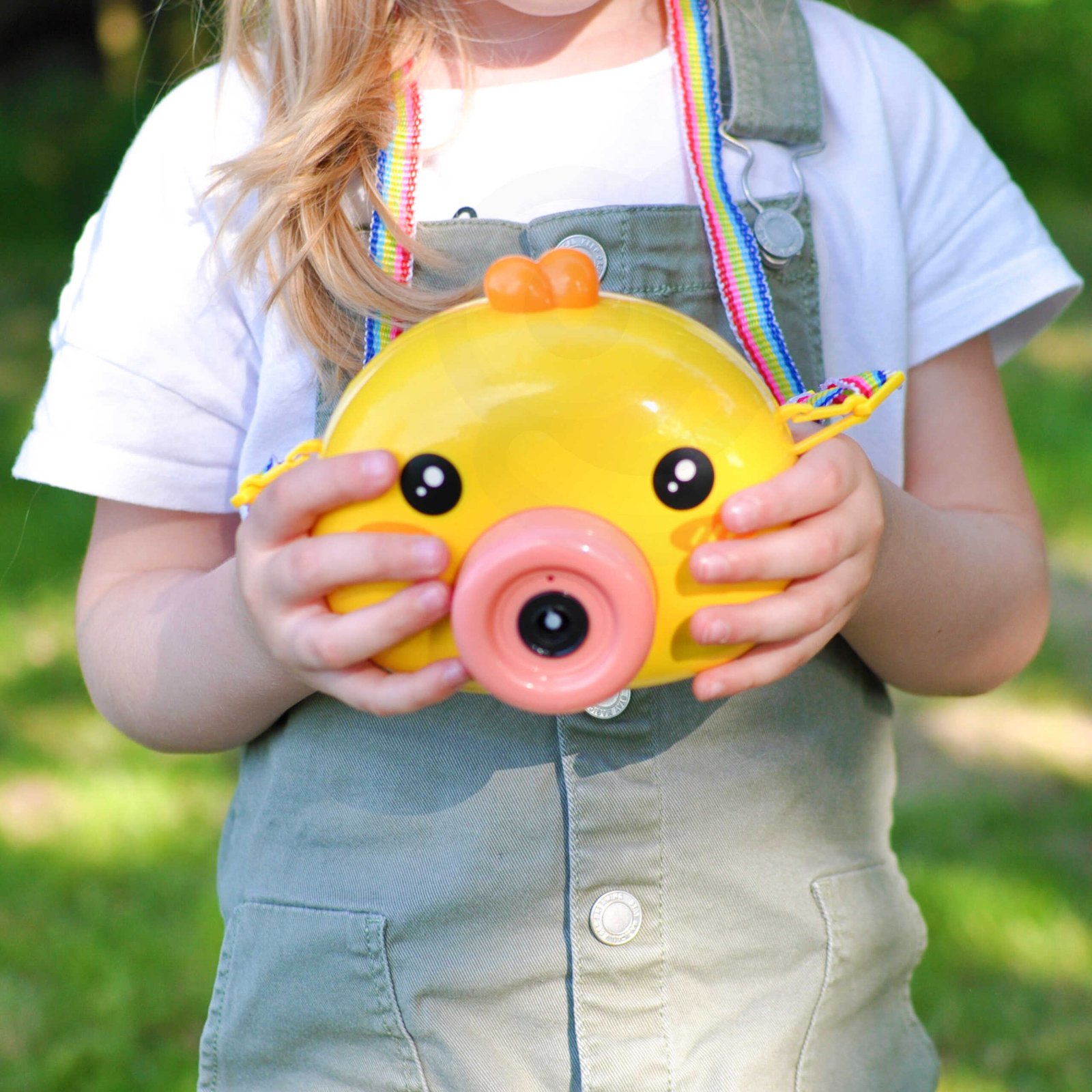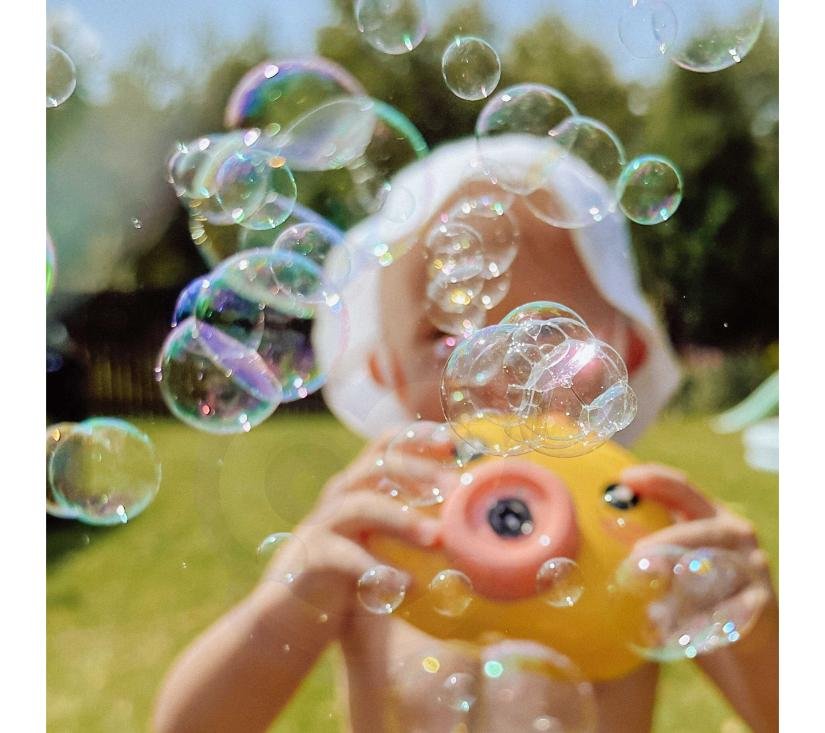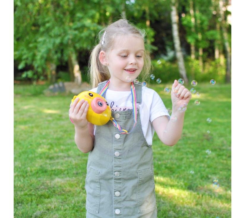 Stroj za mjehuriće Woopie u obliku pileta odlična je igračka za djecu. Dok pile puše mjehuriće, svira ugodnu melodiju koja zabavu čini još ugodnijom. Pušteni mjehurići ne samo da se ispucavaju visokom frekvencijom , već ih dodatno ugrađeni ventilator raspuhuje još više. Tu je i posuda za tekućinu za mjehuriće i vezica za objesiti igračku oko vrata.
