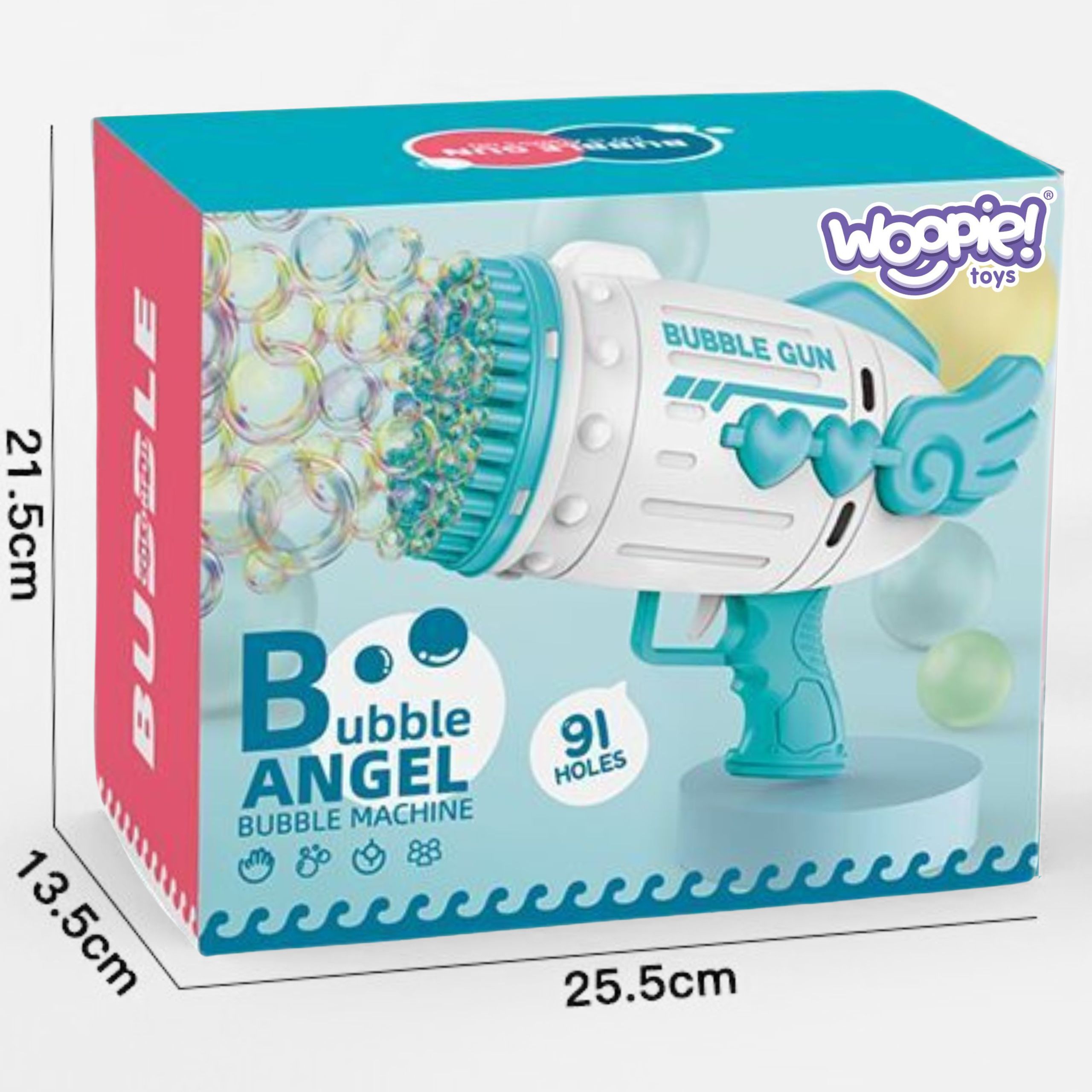 WOOPIE stroj za mjehuriće u obliku pištolja odlična je igračka za djecu. Pušteni mjehurići pucaju visokom frekvencijom zahvaljujući 91 rupici . Mjehurići od sapunice omiljena su igra male i velike djece. Pištolj za mjehuriće od sapunice savršen je poklon jer je jednostavan za korištenje i pruža puno zabave – jednim pritiskom na okidač, mnoštvo mjehurića izleti iz pištolja. Dodatno, set uključuje 2 posude s tekućinom za kupiranje . Igračka je savršena za igru vani ili kod kuće . Za puhanje mjehurića od sapunice, nakon umetanja baterije, jednostavno umočite pištolj u tekućinu na postolju, pritisnite okidač pištolja i to je to! U trenu imamo prekrasan, bajkovit svijet koji će oduševiti i djecu i odrasle.