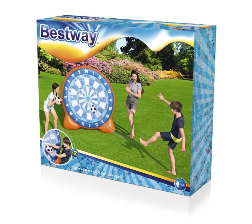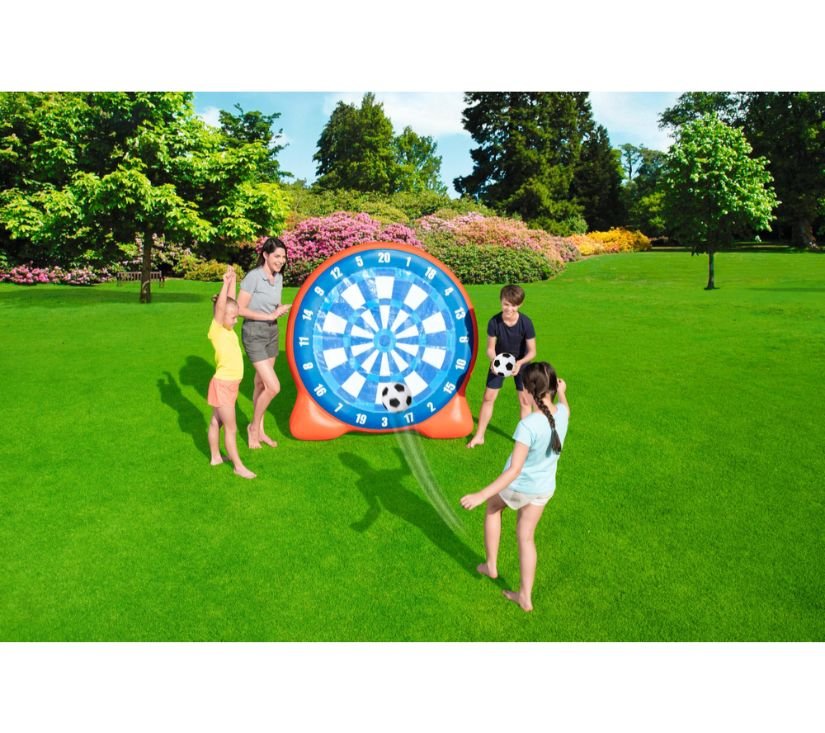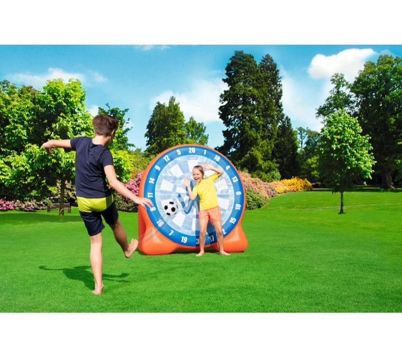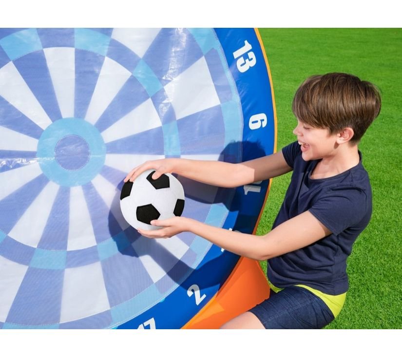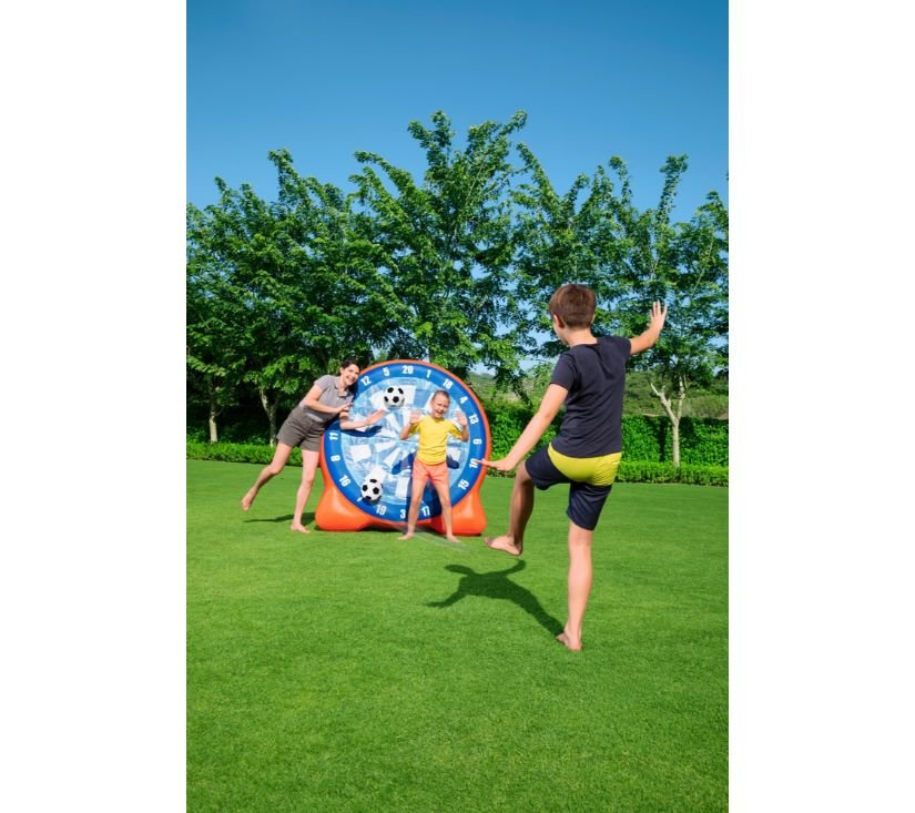 Meta na napuhavanje savršena je zabava na otvorenom za cijelu obitelj. Lopte koje se nalaze u setu prianjaju uz metu, zahvaljujući čemu lako možete izračunati osvojene bodove i moći ćete se natjecati sa svojim prijateljima. Igra trenira točnost i koordinaciju nogu i očiju. Izrađen od izdržljivog materijala, meta je otporna na oštećenja.