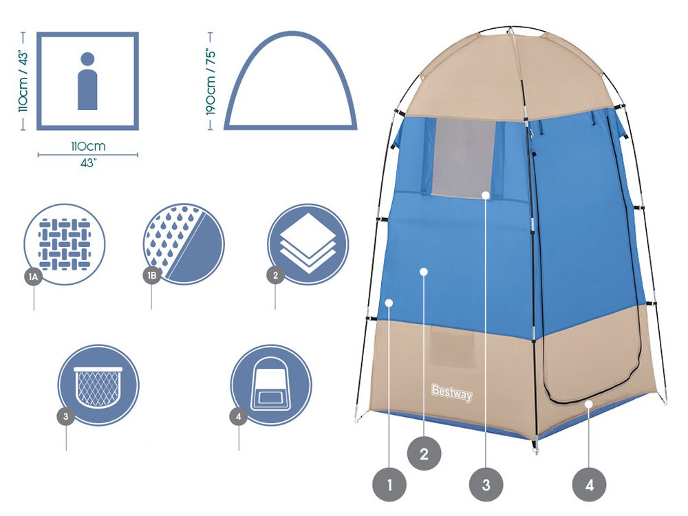 Bestway turistička svlačionica je praktičan šator koji će služiti kao privatna svlačionica na plaži, bazen, jezero ili kamp. Moći ćete se presvući iz mokrog kupaćeg ili samo presvući bez srama. Visoki šator omogućit će vam slobodno kretanje prilikom presvlačenja. Dobro će poslužiti i npr. kao skladište za igračke na napuhavanje u kampu, ili šator može poslužiti na tržnici gdje se nema gdje isprobati hlače :). Svlačionica je opremljena podom koji se može rastaviti radi čišćenja. Lako se rasklapa i sklapa.