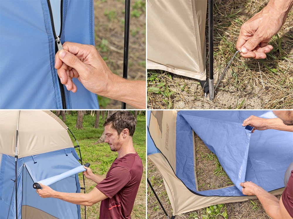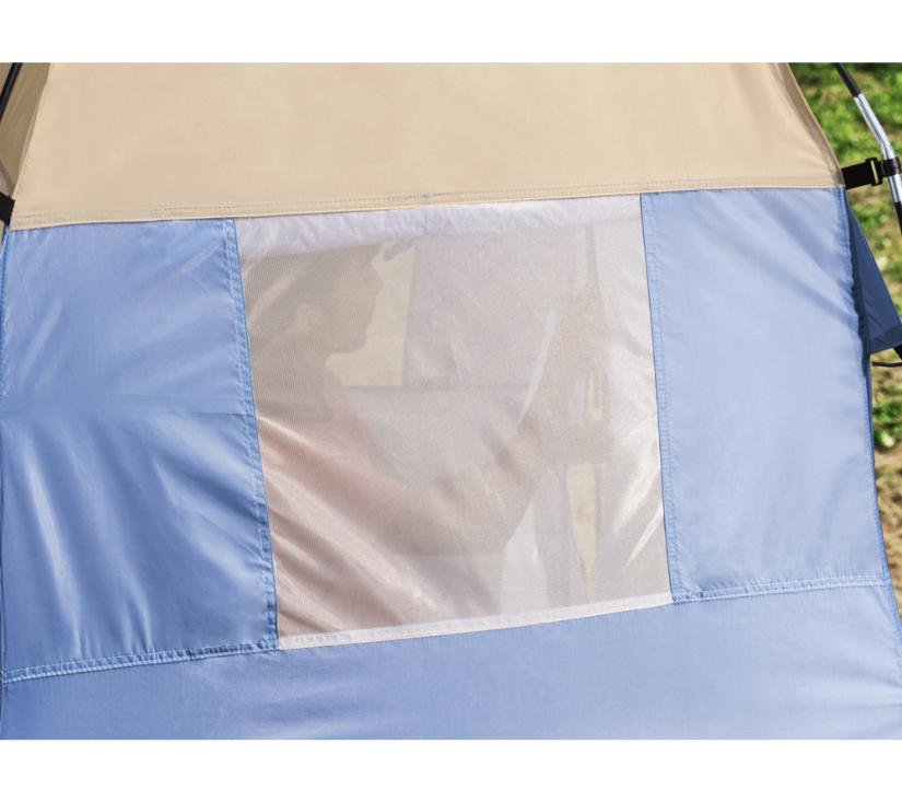 Velika prednost su vrata s patentnim zatvaračem koja se lako mogu potpuno otvoriti i pričvrstiti na dio zid tako da možete slobodno izaći ili prozračiti prijenosnu prostoriju. Dodatno, šator ima tri neprozirna prozora koja se također lako mogu otkriti.