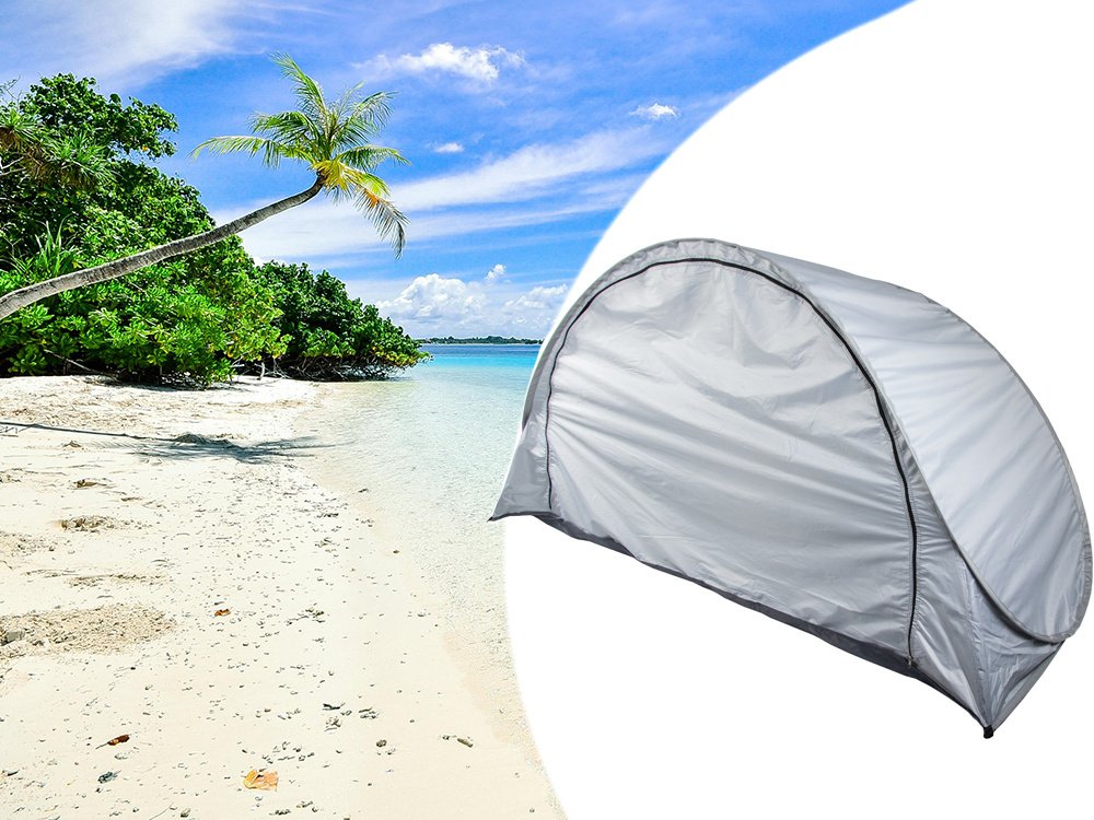 Šator nudi učinkovitu zaštitu od UV zraka , što je izuzetno važno tijekom duljeg izlaganja suncu. Osim toga, štiti od vjetra i pijeska, stvarajući ugodan prostor za opuštanje.