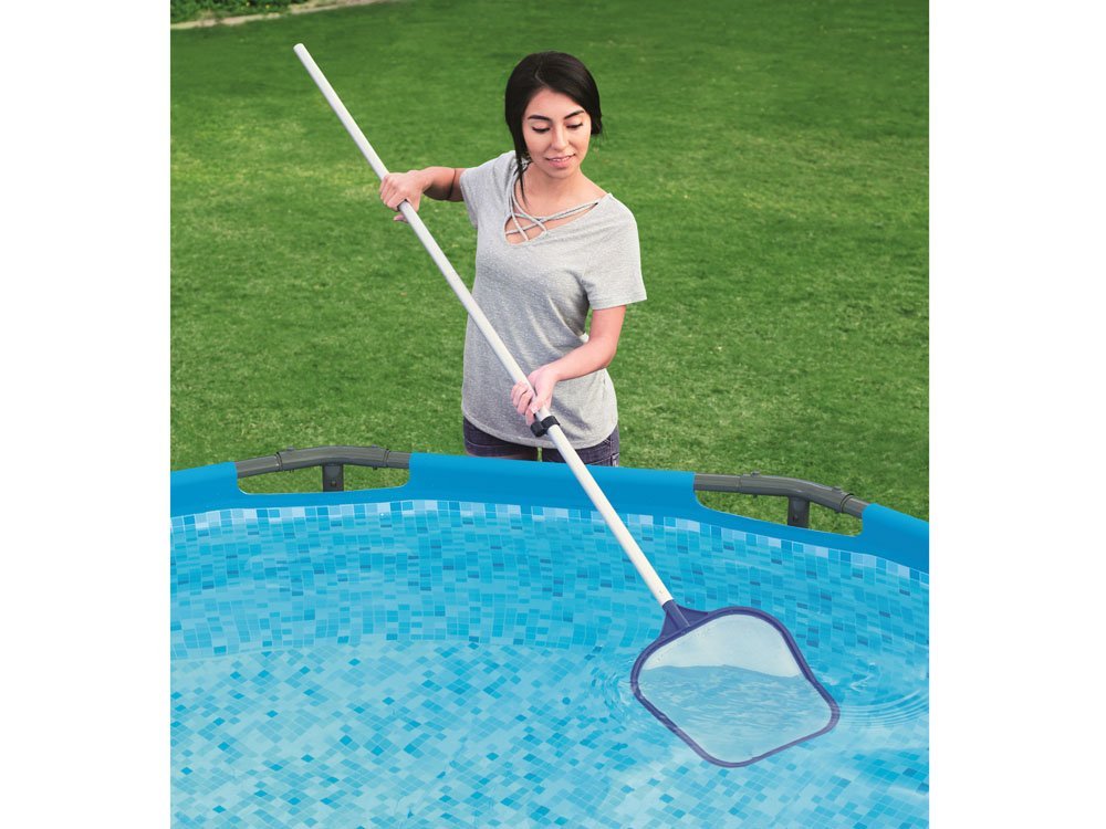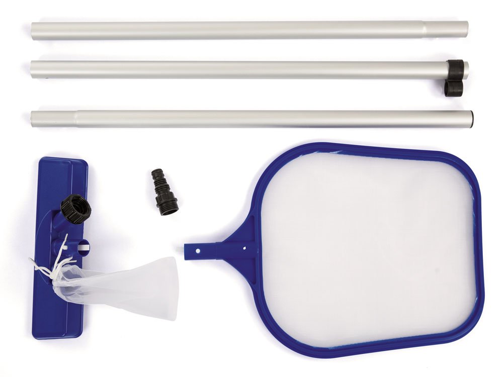 Bestway set za čišćenje bazena pomoći će vam da voda ostane čista, tako da možete biti sigurni da se vi i vaša djeca možete kupati s osjećajem sigurnosti i rashladiti za vrućih dana. Lagani aluminijski štap s dva izmjenjiva vrha znatno će olakšati održavanje bazena čistim i urednim. Priključak za podmetnu mrežu ima izdržljivu mrežicu i izrađen je od čvrste plastike. Nastavak za usisavač je jednodijelna glava, koja ima vrećicu za prljavštinu i otpad iz bazena, treba ga spojiti na vrtno crijevo.
