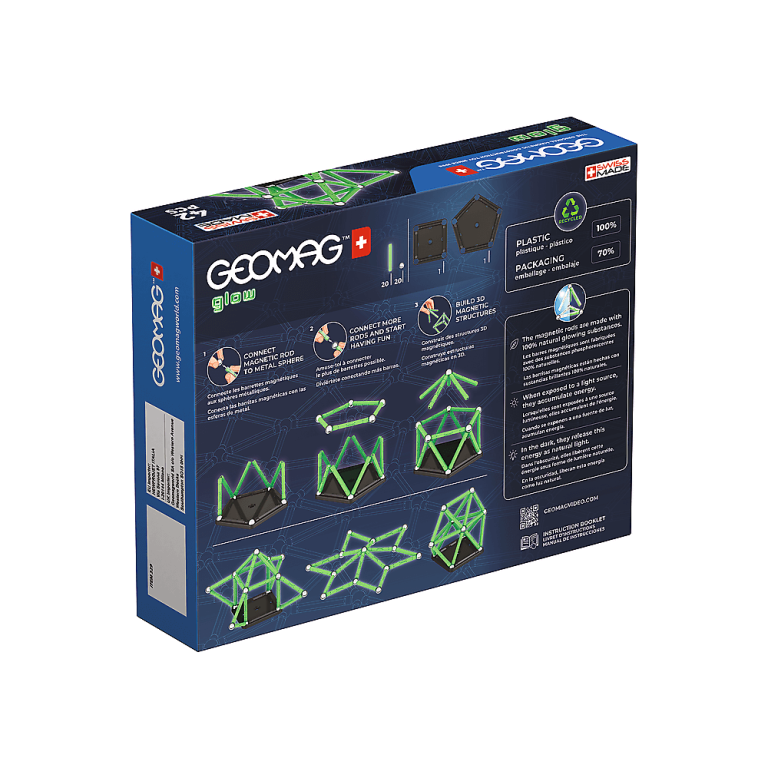Linija GLOW vam omogućuje da gledate svoje Geomag modele kako svijetle noću zahvaljujući nevjerojatnom GLOW efektu prirodnih luminiscentnih materijala koji hvataju i vraćaju sunčevu svjetlost.