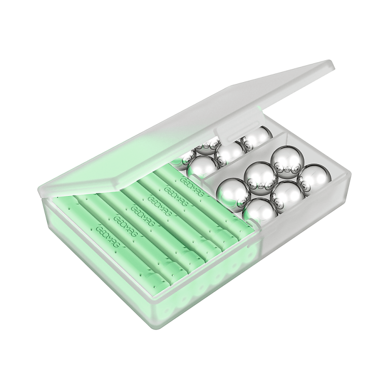 Set za igru ??uključuje 20 svjetlećih magnetskih šipki, 20 metalnih kugli, 1 kvadratnu platformu, 1 peterokutnu platformu. Uključene su 2 Geomag kutije.