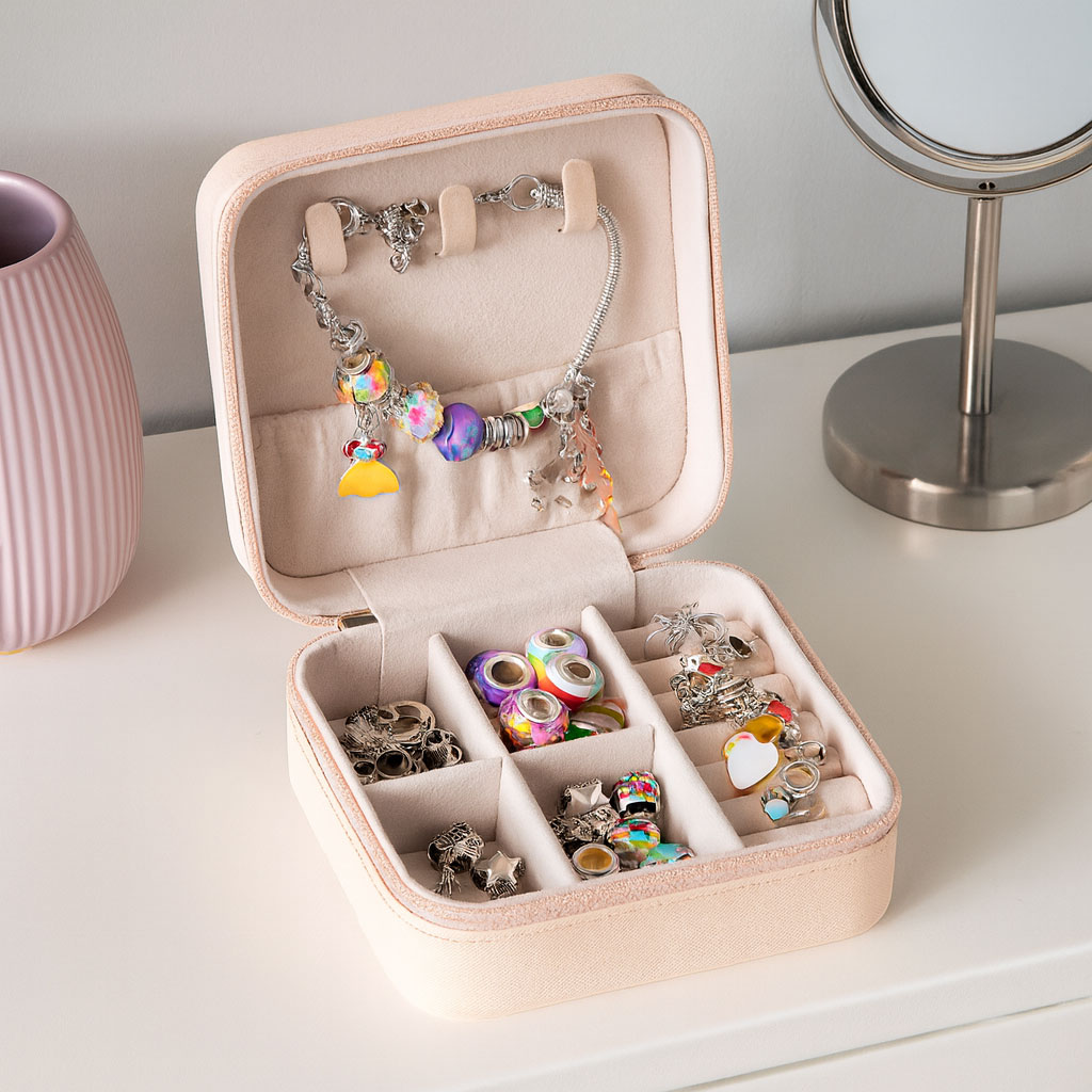Set uključuje praktični organizator koji pomaže u održavanju urednosti pribora. Zahvaljujući pretincima, svaki komad ima svoje mjesto, a djeca uče brinuti se za svoja blaga. Cijeli set može se spakirati u slatku vrećicu “Princeza” – savršeno za darivanje i za dodatnu zabavu pakiranja ručno izrađenog nakita.