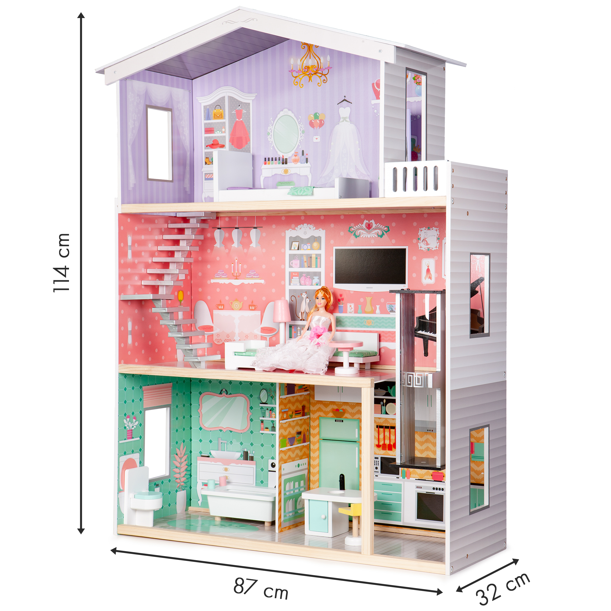 Cijela kuća je izrađena od visokokvalitetnog drva, što jamči dugogodišnju zabavu. Na prvoj etaži nalazi se kupaonica i kuhinja, obje sobe opremljene najpotrebnijim namještajem. Prva dva nivoa povezana su pokretnim liftom, što će se sigurno svidjeti vašem djetetu. Drugi kat je u cijelosti namijenjen za dnevnu sobu za lutke, opremljenu lounge garniturom. Na gornjem katu pronaći ćemo spavaću sobu za lutku s izlazom na terasu.