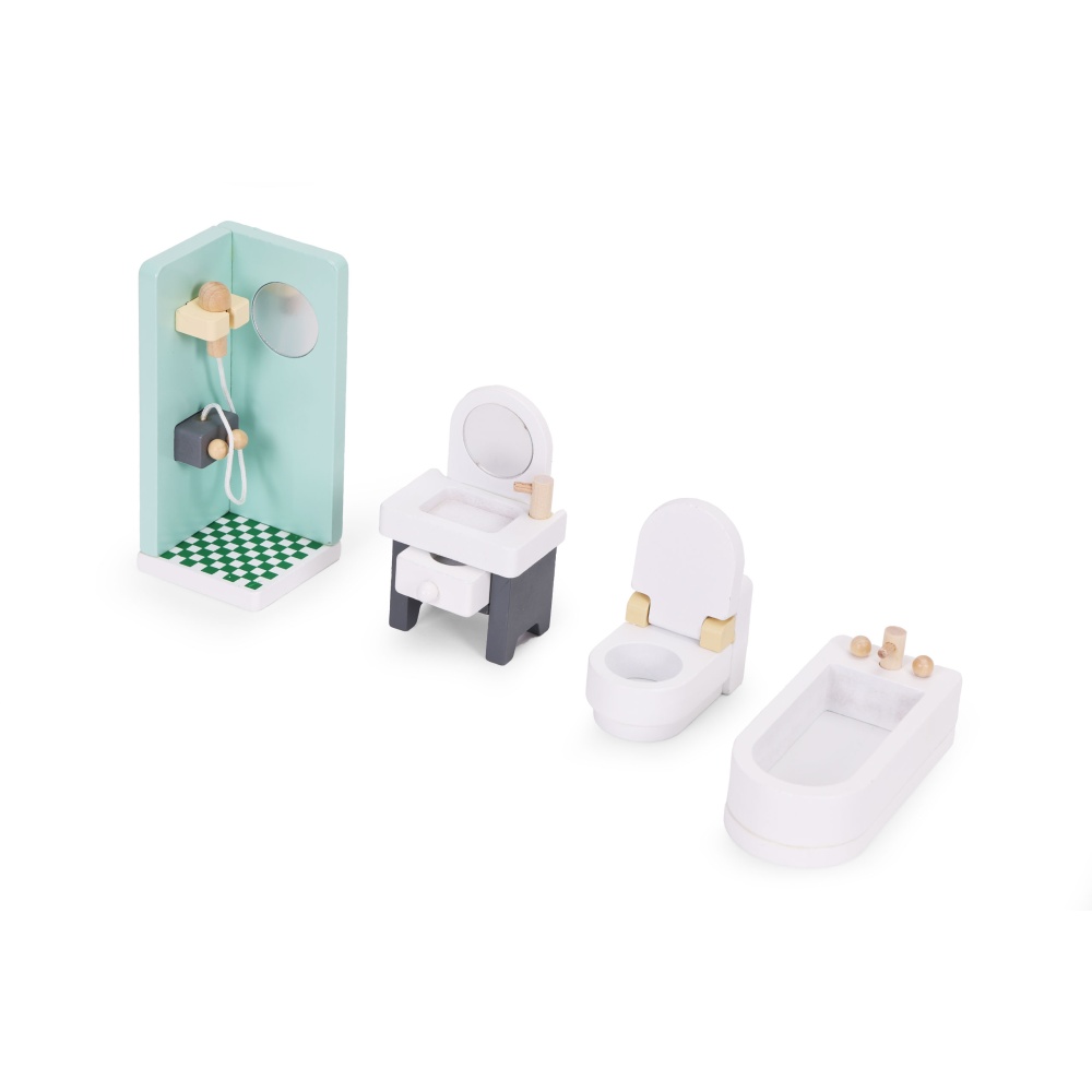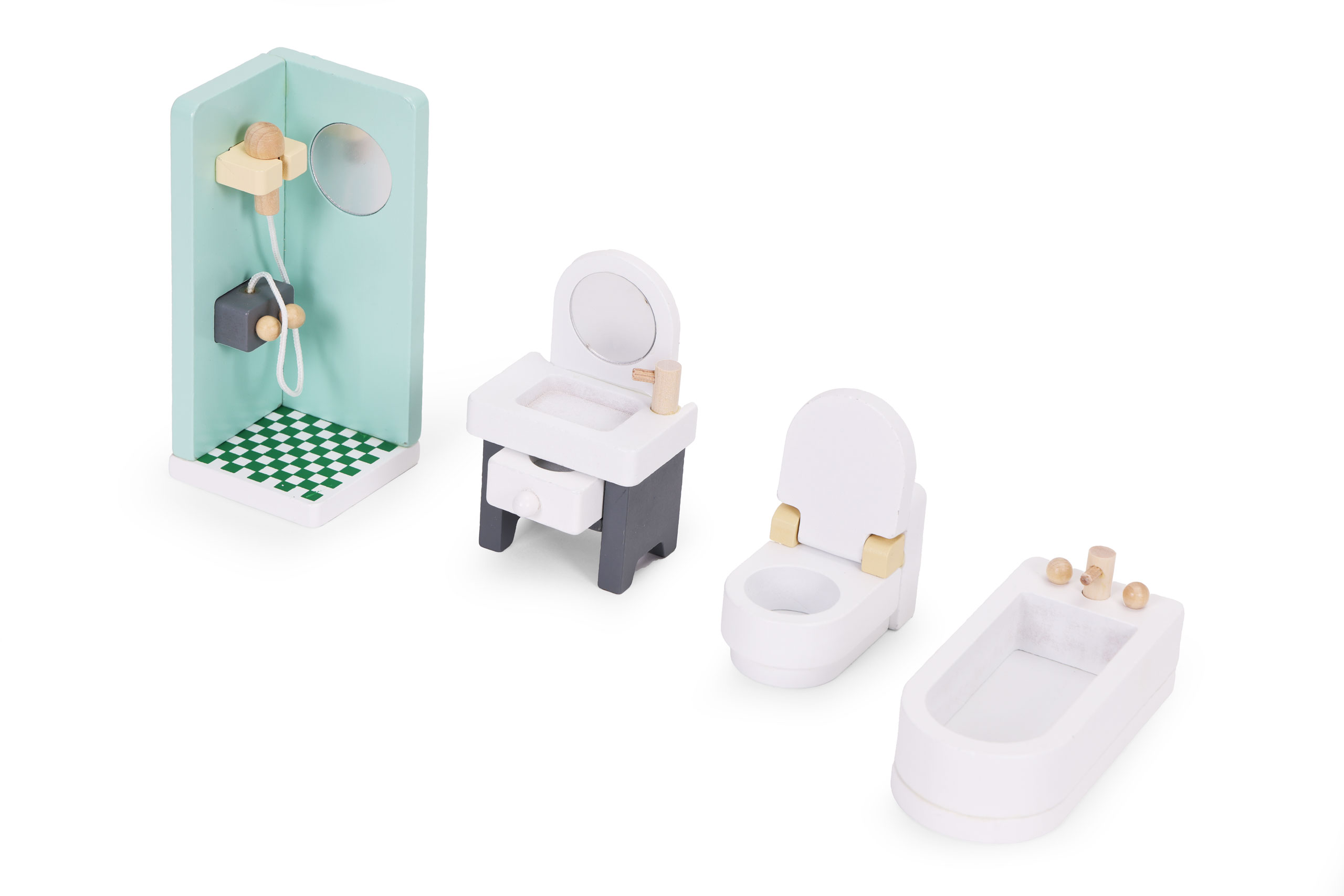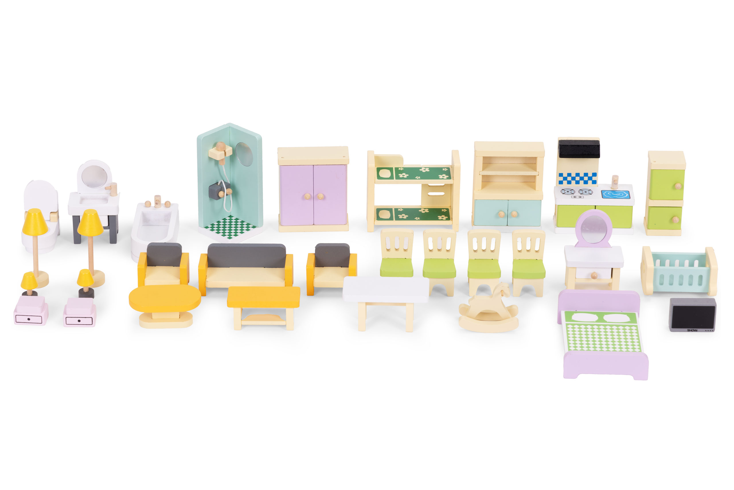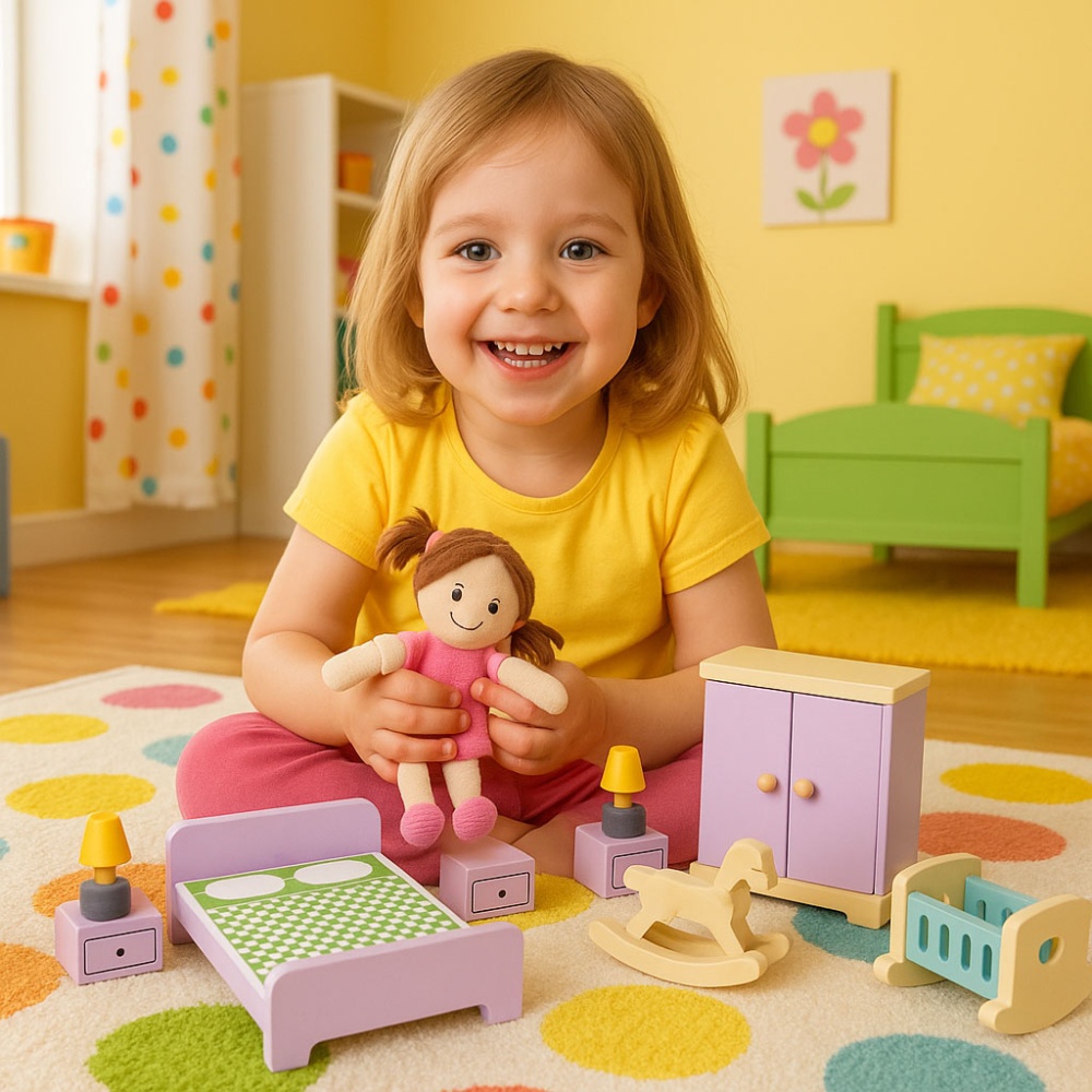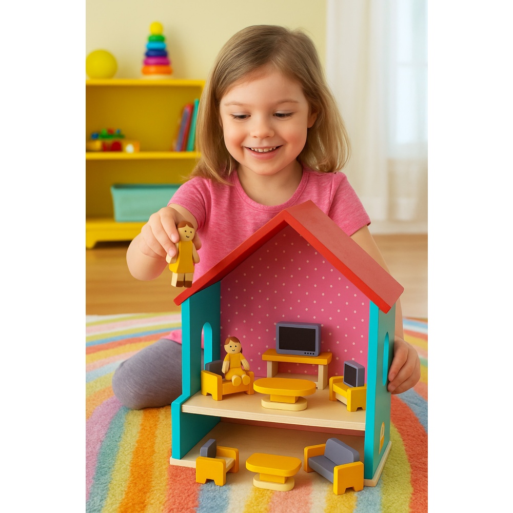 Drveni set namještaja savršen je dodatak svakoj manjoj kućici za lutke , ali također odlično funkcionira kao samostalni kreativni set za igru . Dijelovi su dizajnirani imajući na umu manje lutke , što ih čini idealnim za kompaktne prostore i eliminira potrebu za velikom kućicom za lutke. S raznim komadima namještaja, djeca mogu opremiti dnevni boravak, spavaću sobu, kuhinju, kupaonicu i blagovaonicu – stvarajući vlastite priče i glumeći svakodnevne situacije. Ovaj oblik igre razvija maštu, uči planiranju i podržava emocionalni rast . Namještaj se može slobodno preuređivati i kombinirati, potičući kreativno razmišljanje i grupnu igru s vršnjacima.