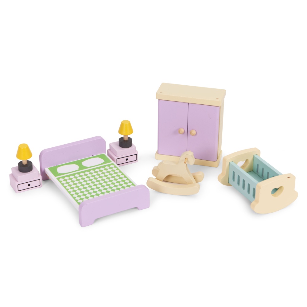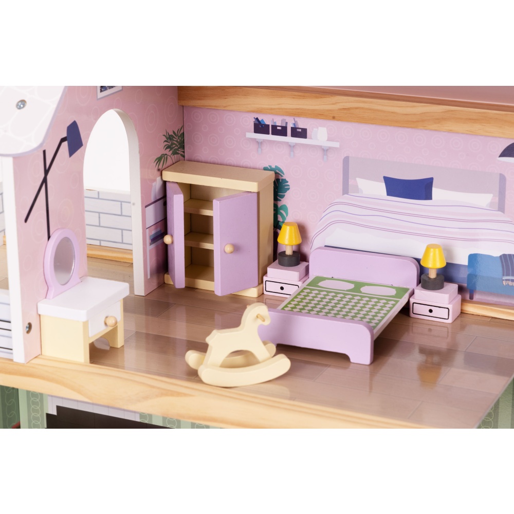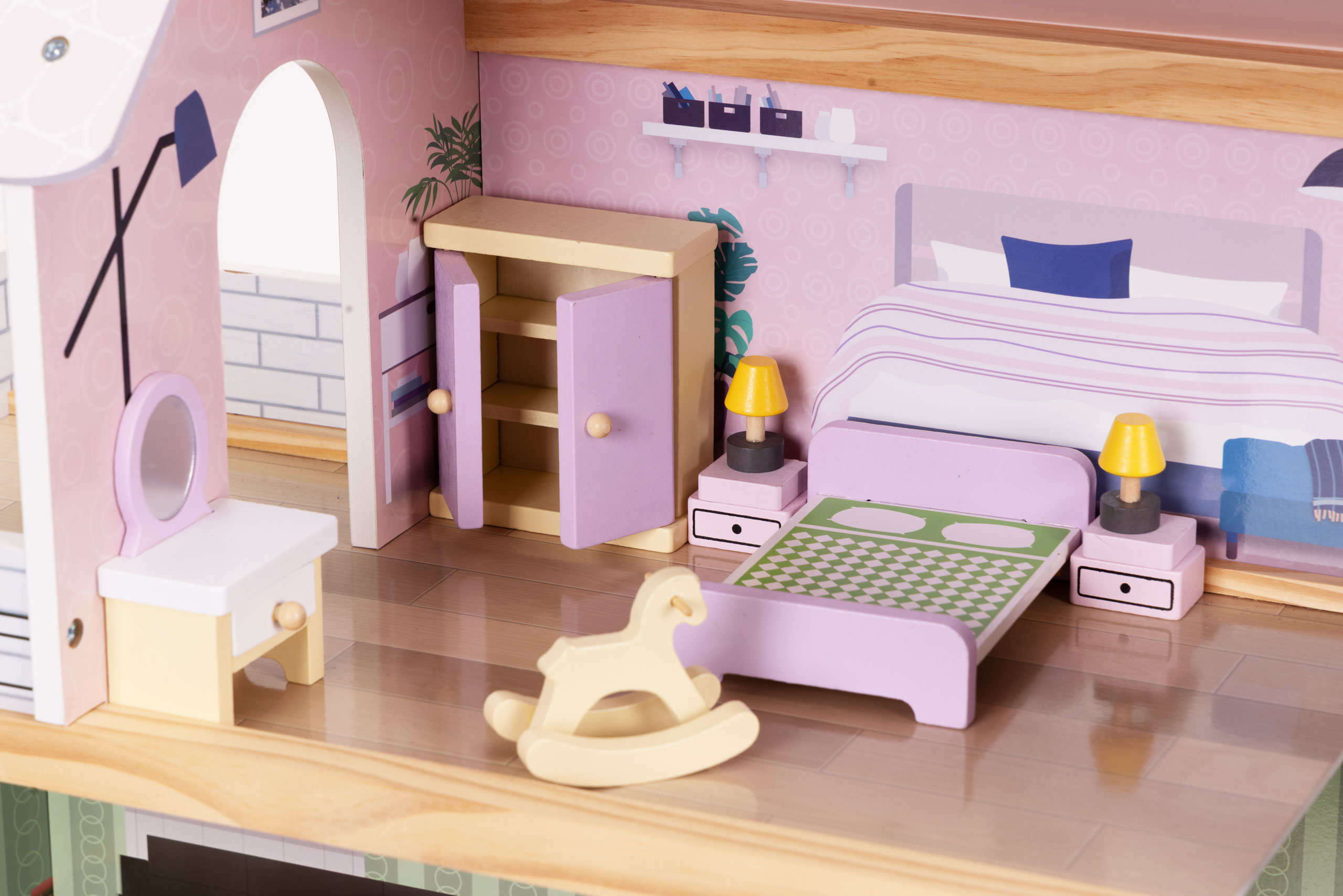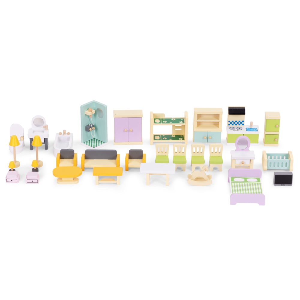 Set uključuje čak 30 drvenih dijelova koji vam omogućuju opremanje cijele kućice za lutke. Među njima je namještaj za različite sobe: