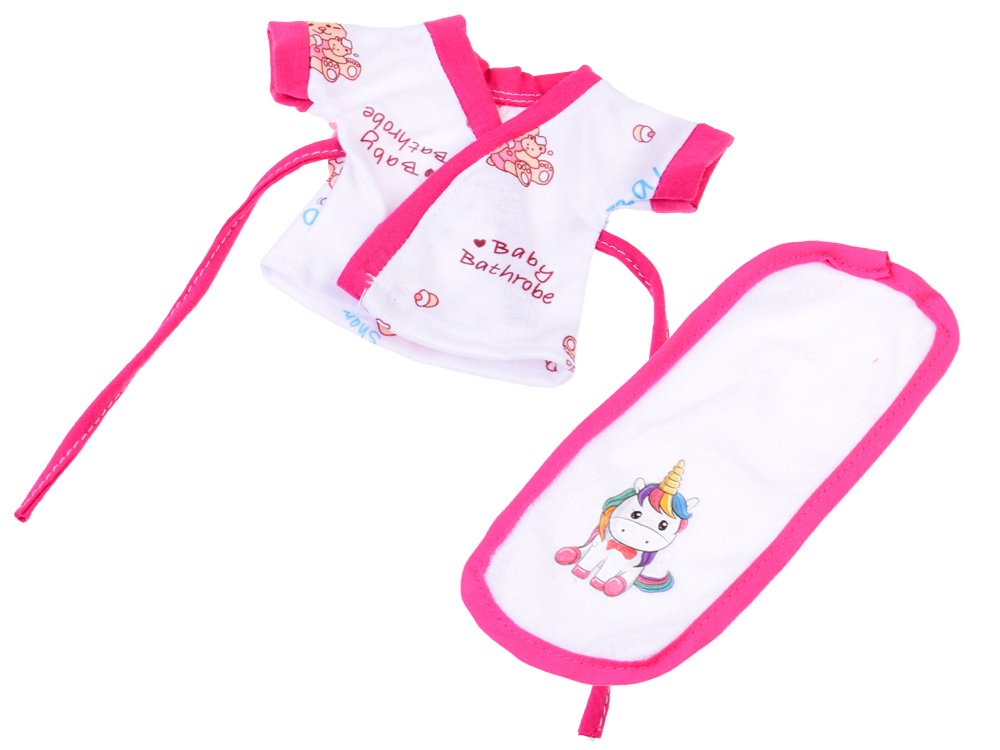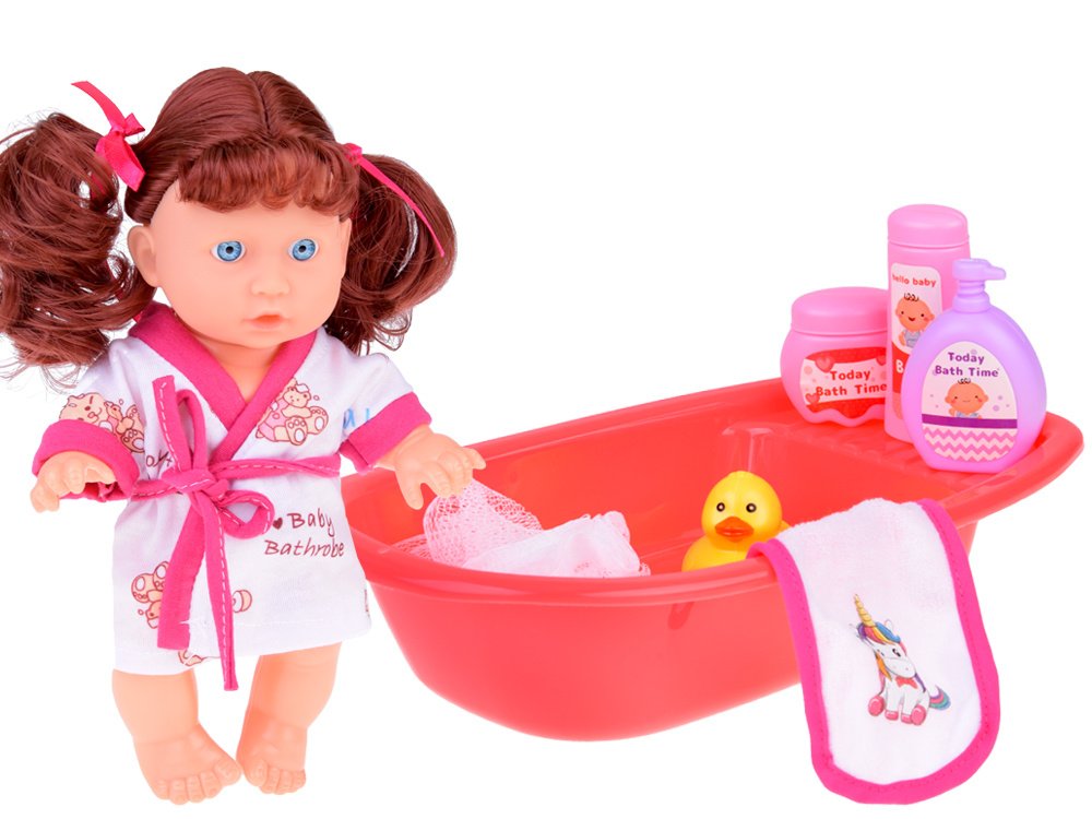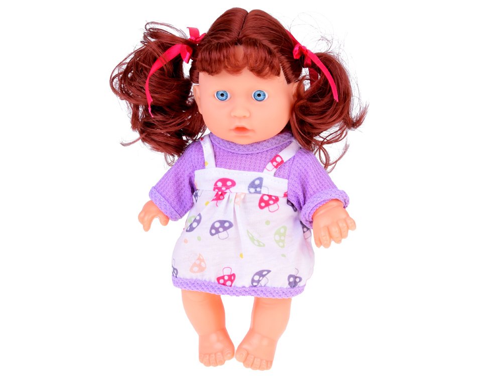 Set uključuje prekrasnu lutku plavih očiju i duge kestenjaste kose. Nosi šarmantnu bijelo-ljubičastu haljinu sa šarenim gljivama. Cijeli outfit nadopunjuju šarmantne ružičaste vrpce u kosi lutke. Torzo, ruke i noge igračke izrađeni su od plastike, a glava od gume. Zahvaljujući bočici za hranjenje koja se nalazi u setu, lutki će biti vrlo jednostavno dati vodu, a u kadici u koju možemo natočiti pravu vodu, pobrinut ćemo se za čistoću bebe. U kompletu se nalazi i kućni ogrtač zahvaljujući kojem će biti moguće presvući bebu.