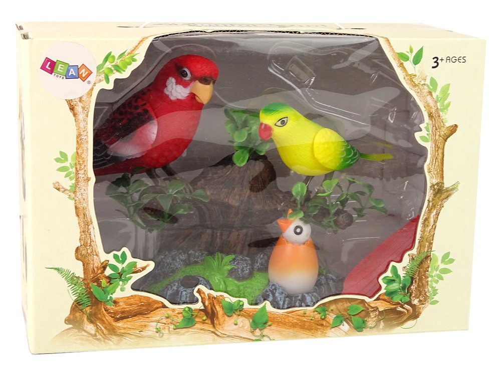 U setu se nalaze dvije papige – crvena i žuta, koje se nalaze na grani drveta i mala papiga u školjci koja leži ispod nje.