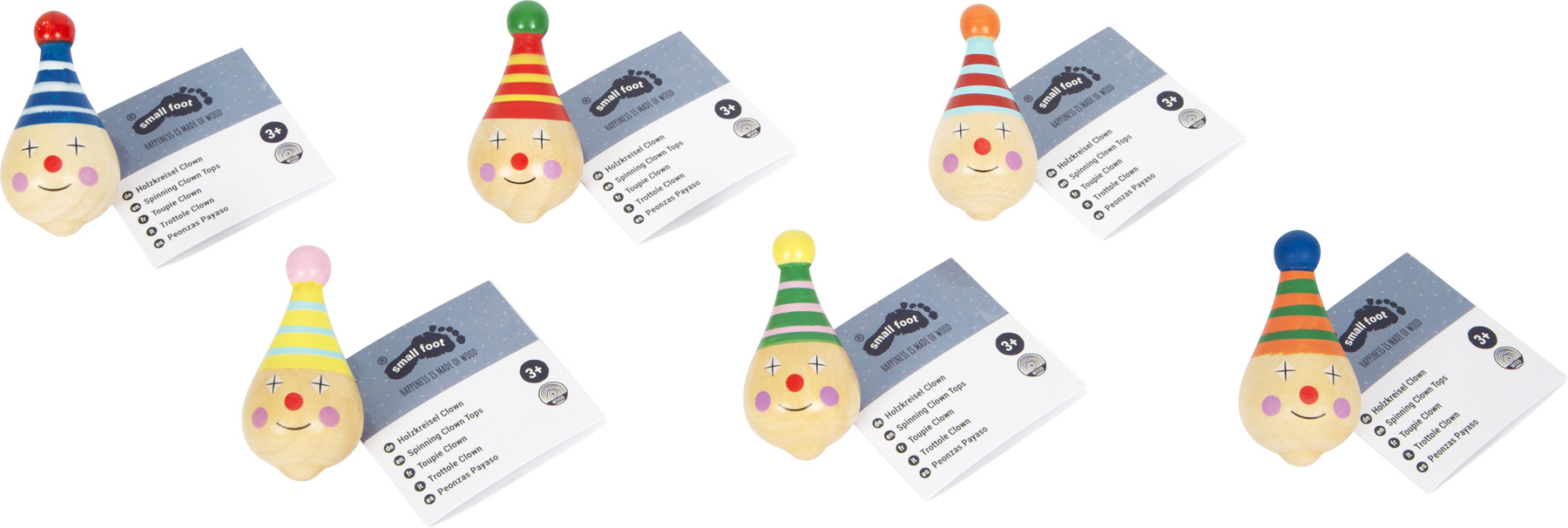 Ove drvene vrtljače s licima klaunova lakirane su obojenim i prozirnim lakom i pravi su izazov za motoriku prstiju! Kad se ovi vrhovi vrte, dječje oči sjaje! Savršena last minute kupnja na prodajnom mjestu.