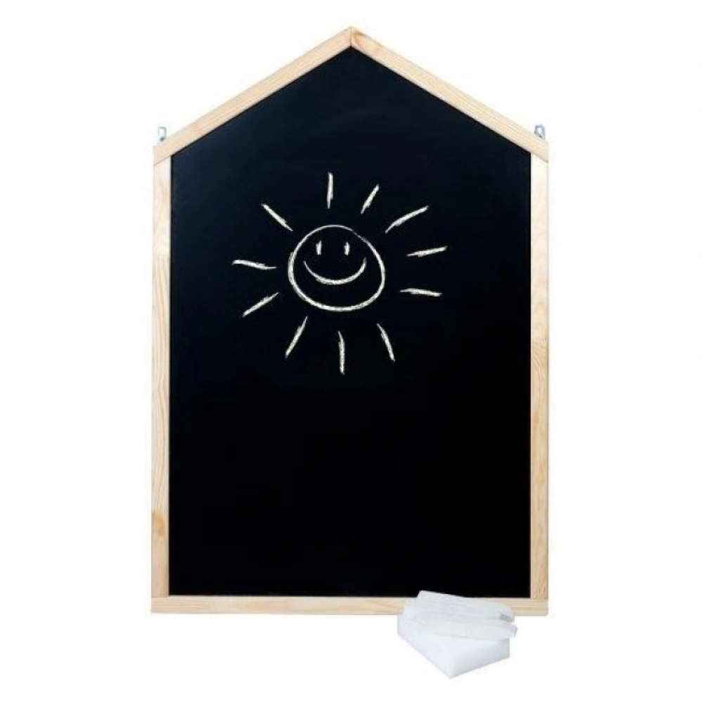 Ploča “Kuća 1” je jednostrana, viseća, magnetska ploča za kredu od prirodnog drva s magnetskom crnom površinom. Set uključuje kredu, gumicu i vješalice.