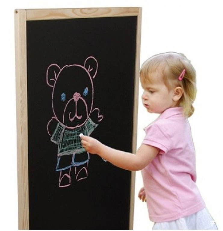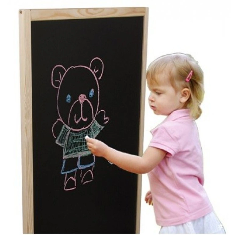 Vrlo velika, dvostrana, prirodna drvena ploča za crtanje kredom s velikom površinom za crtanje kredom s obje strane. Ploča uključuje kredu i gumicu.