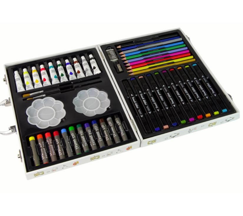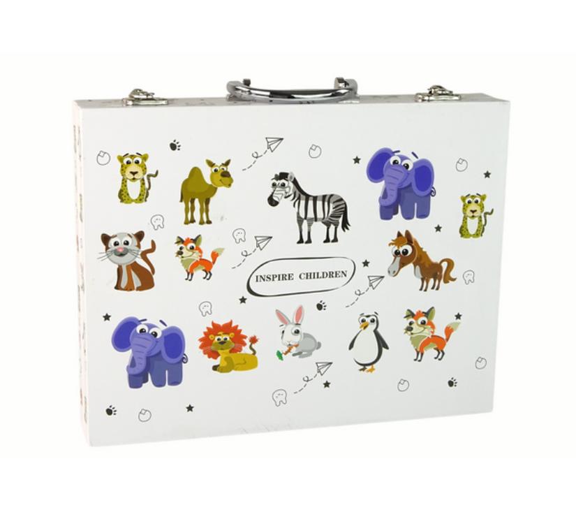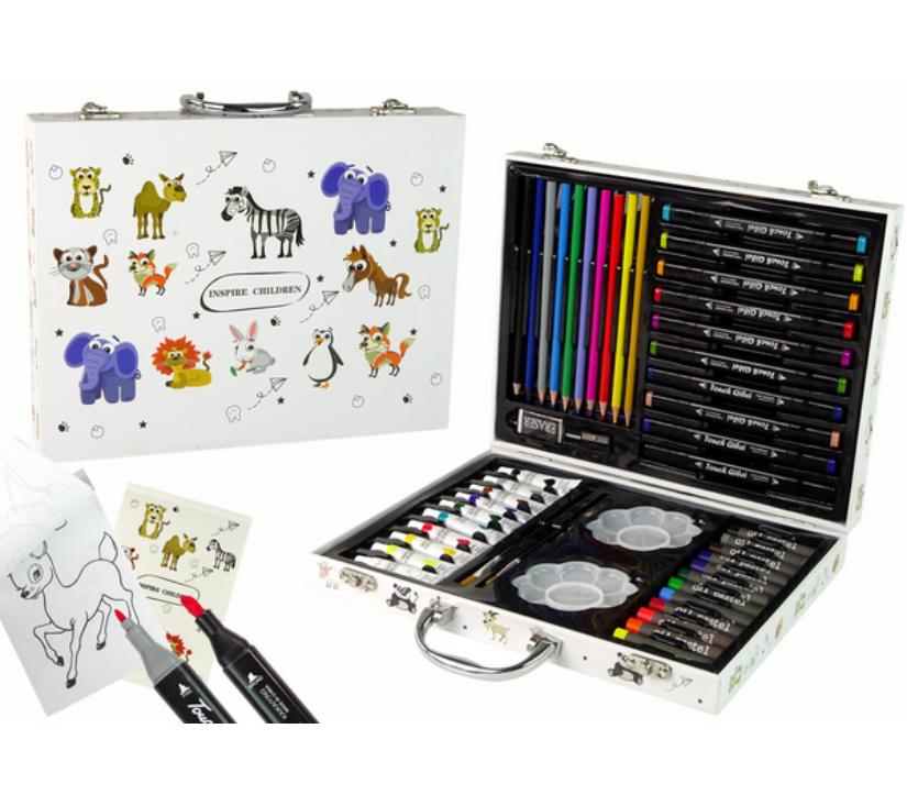 Ovaj umjetnički set u bijelom, čvrstom koferu s prijateljskim životinjama savršen je poklon za male umjetnike koji žele otkriti svijet umjetnosti i zabave. Ovaj mali umjetnički set sadrži 68 elemenata poput bojica, markera, boja i kistova. Ovaj umjetnički set razvija dječju kreativnost i maštu, podržava razvoj slikarskih i crtačkih vještina te ih potiče na eksperimentiranje s bojama i tehnikama. Dajte svom djetetu priliku da se izrazi kroz umjetnost već danas!