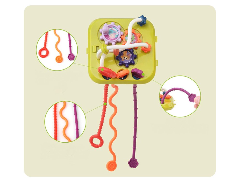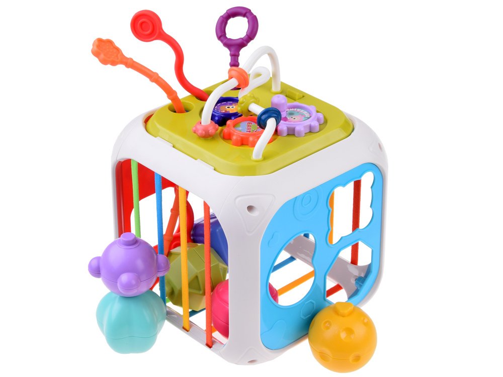 Kocka sorter je proizvod koji će sigurno zainteresirati i privući pažnju svakog mališana. Blokovi su izrađeni od visokokvalitetne plastike u nježnim bojama i oblicima. Na tri stijenke kocke nalaze se gumene trake u boji, dok se na sljedeće dvije nalaze stijenke s tri rupe različitih oblika. Zadatak djeteta je spojiti oblik bloka s odgovarajućom rupom. Osim toga, zadnji zid se može koristiti s obje strane. Prva strana su male obojene činele i žice različitih struktura za povlačenje s jedne strane na drugu. Druga strana ima kolute u boji i mogućnost pomicanja malih perli u boji. Igra uključuje umetanje i uklanjanje elemenata iz obrazovne kocke. Tijekom igre djeca razvijaju osjetila i usavršavaju manuelne sposobnosti. Svaki blok se ističe i potiče djetetovu znatiželju da ih izvadi i vrati u sortirku. Ova igračka spaja najbolje karakteristike ručnih igračaka s mogućnošću razvoja misaonih sposobnosti.