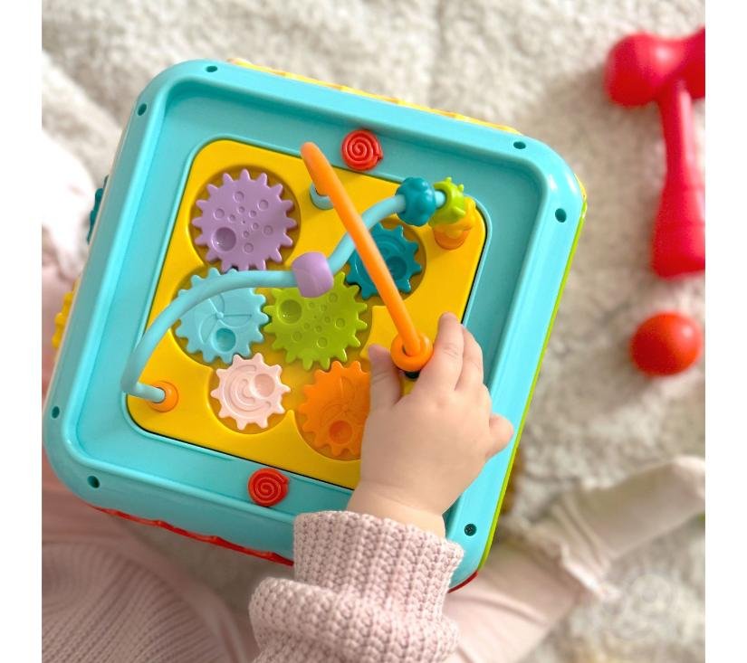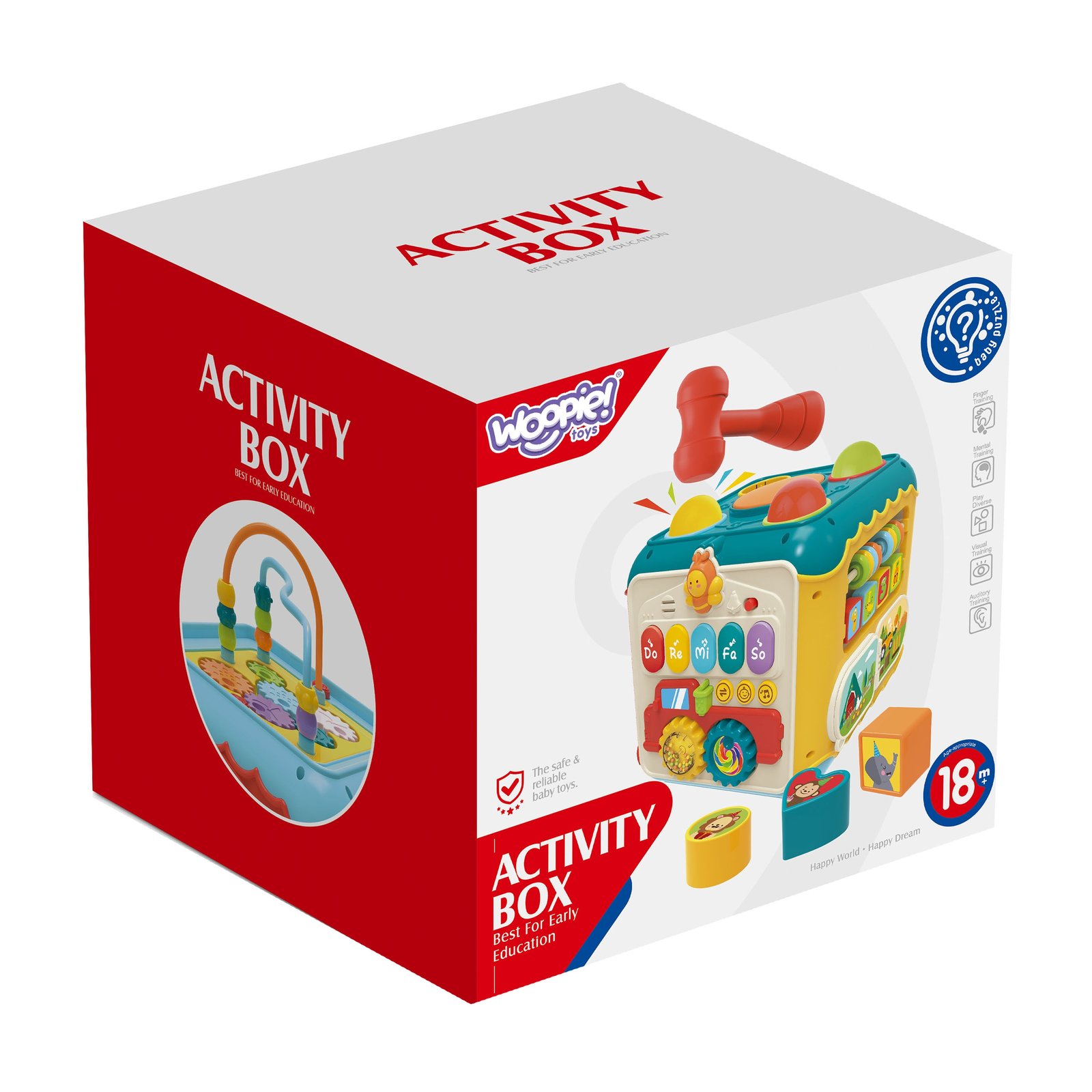 6-u-1 Activity Box marke WOOPIE je igračka koja vašem djetetu nudi mnogo različitih i zanimljivih aktivnosti. Svaka stijenka kutije ima različitu funkciju, što igračku čini univerzalnom i prilagođenom različitim interesima i razvojnim fazama djeteta. U kutiji se nalazi klavir na kojem dijete može svirati tipkama koje ispuštaju prijateljske zvukove i bušilica kojom dijete uz pomoć čekića zabija šarene loptice u kutiju – čekić i loptice su uključeni u set. Svaka je aktivnost pažljivo osmišljena kako bi podržala različite vještine kao što su koordinacija oko-ruka, prepoznavanje oblika i boja, razvoj sluha i izražavanje kreativnosti . Mala veličina Activity Boxa čini ga lako prenosivim , a istovremeno punim beskrajne zabave za male istraživače koji žele učiti kroz igru.