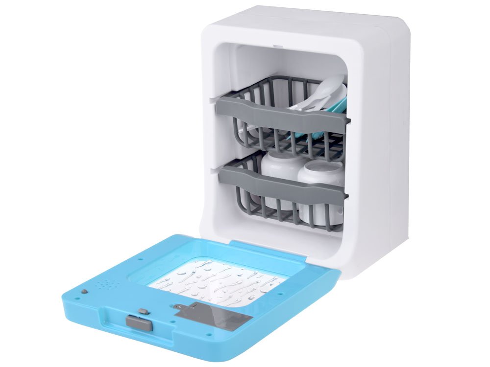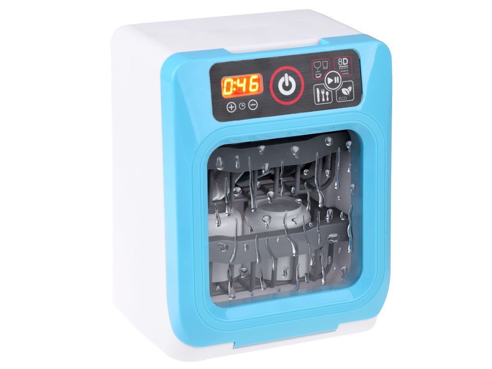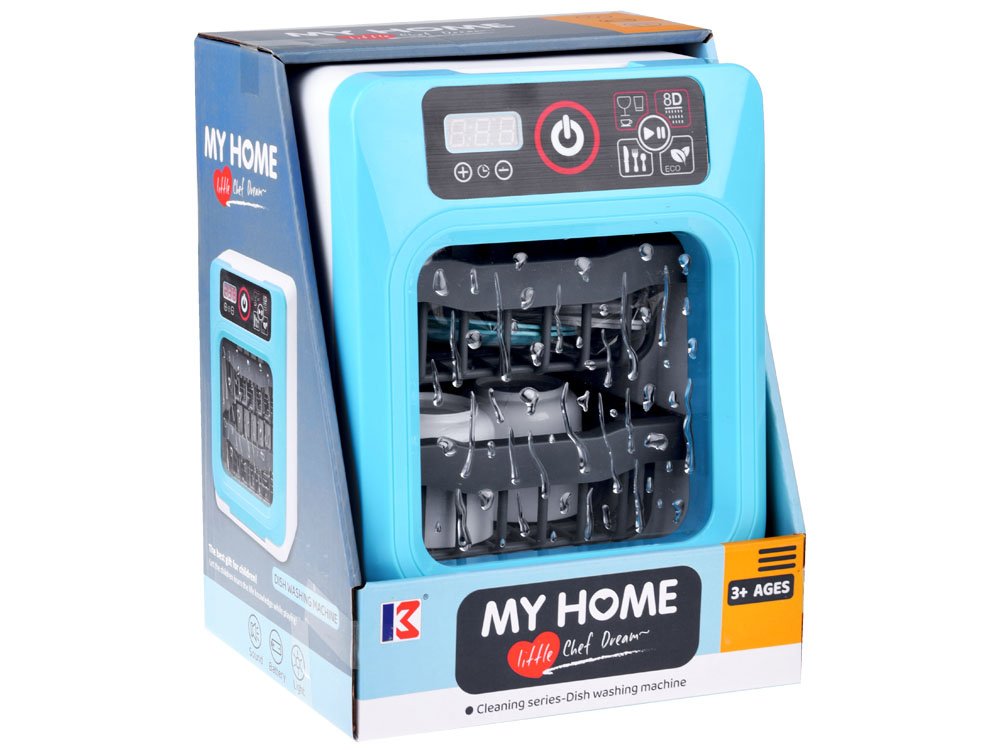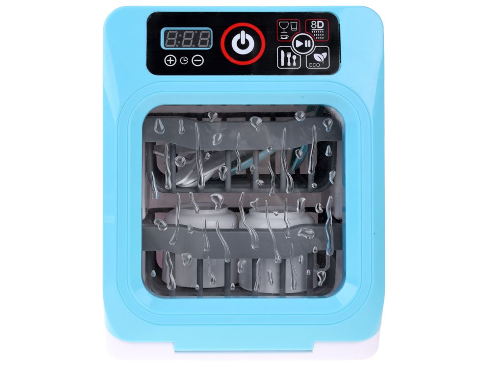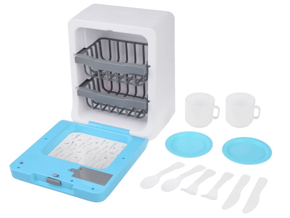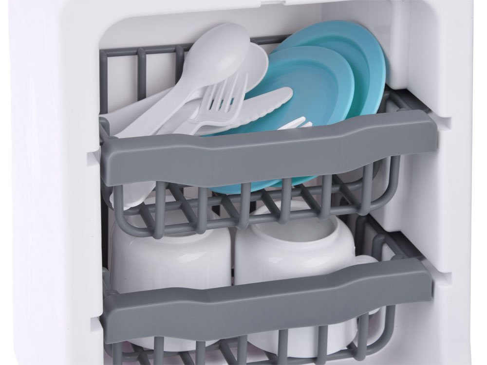 koja će olakšati funkcioniranje kuhinje. Značajke perilice posuđa: – dodirna ploča s programima – elektronički zaslon – gumb za pokretanje perilice posuđa – zvučni efekti (šum vode, pare, signal završetka perilice posuđa) – svjetlosni efekt vidljiv kada perilica posuđa radi – otvaranje vrata u perilici posuđa – izvlačne košare za suđe Set sadrži: – perilica posuđa s dodirnom pločom – set pribora za jelo (2 x nož, 2 x vilica, 2 x žlica, 2 x tanjur, 2 x šalica) Dimenzija igračke: – 23 x 17 x 14 cm Napajanje: – 2 x 1,5 V AA (nije uključeno) Djeca vole oponašati odrasle, tako da će ovakvi ozbiljni kućanski uređaji dodati realizam svakoj igri kod kuće, u restoranima ili kafićima.