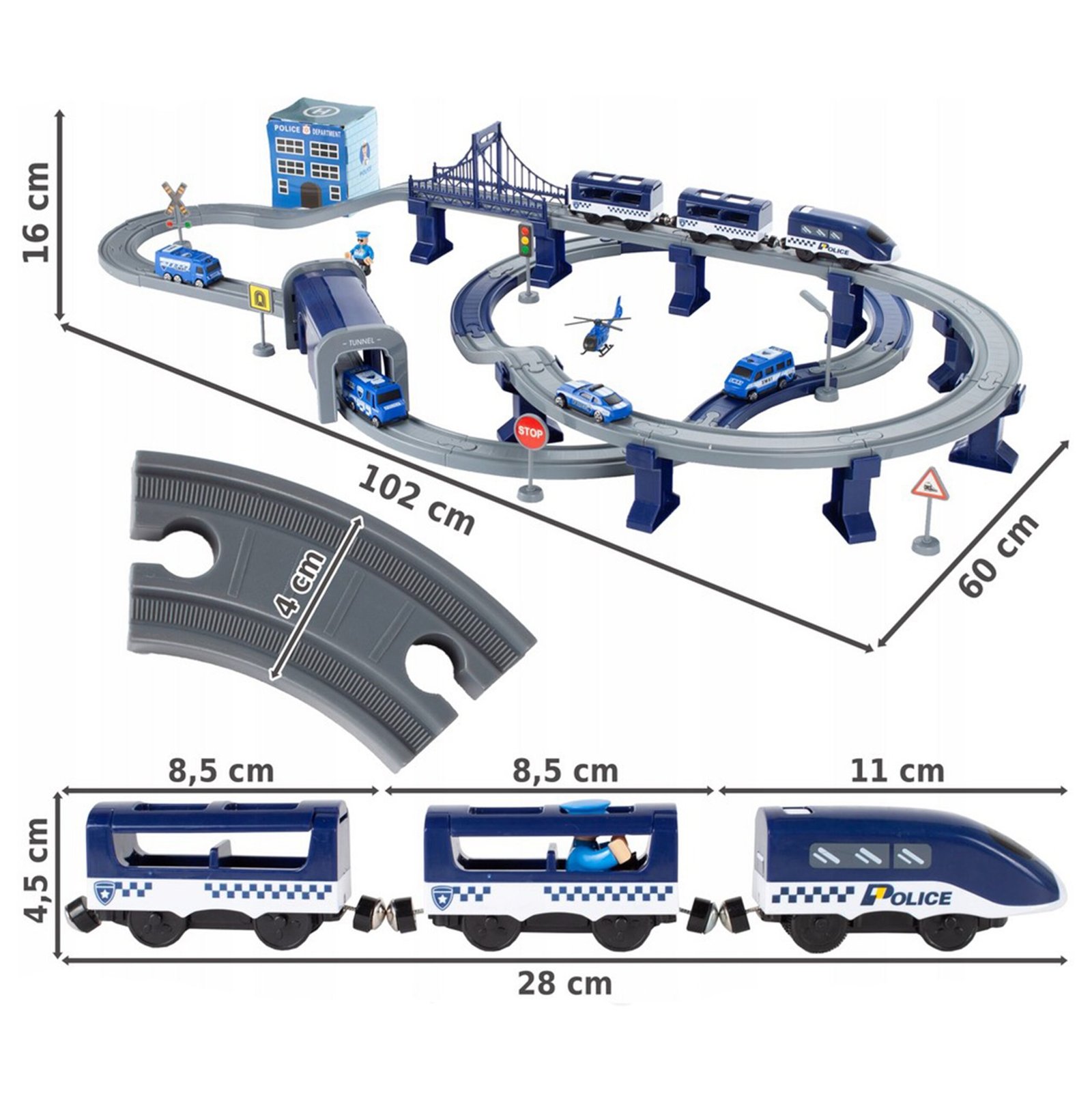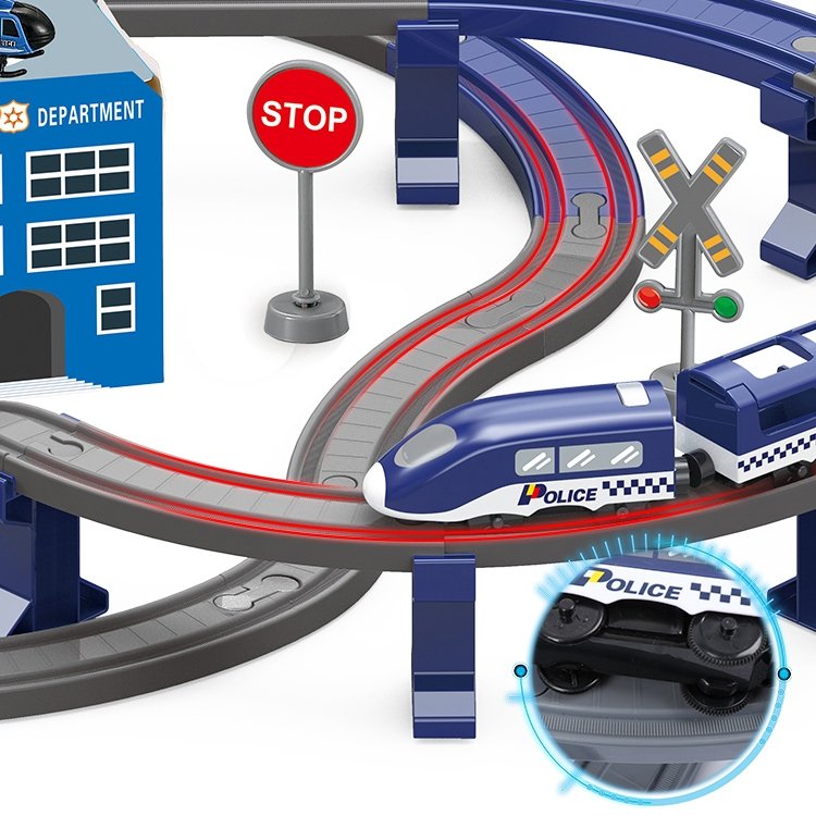 Električni vlak Police Station renomiranog brenda Woopie savršen je prijedlog za vaše male ljubitelje automobila. Šareni vlakić oduševit će djecu svih uzrasta, pružajući brojne atrakcije i beskrajne emocije. Set sadrži 92 elementa , uključujući: moderna lokomotiva na baterije, elementi gusjenice, policijski automobili i helikopter. Ova igračka nije samo zabavna, već i velike razvojne mogućnosti za dijete. Osobito se razvija prostorna orijentacija, tehnički smisao i, naravno, mašta. Vlak je upakiran u originalnu kutiju, savršenu za poklon.