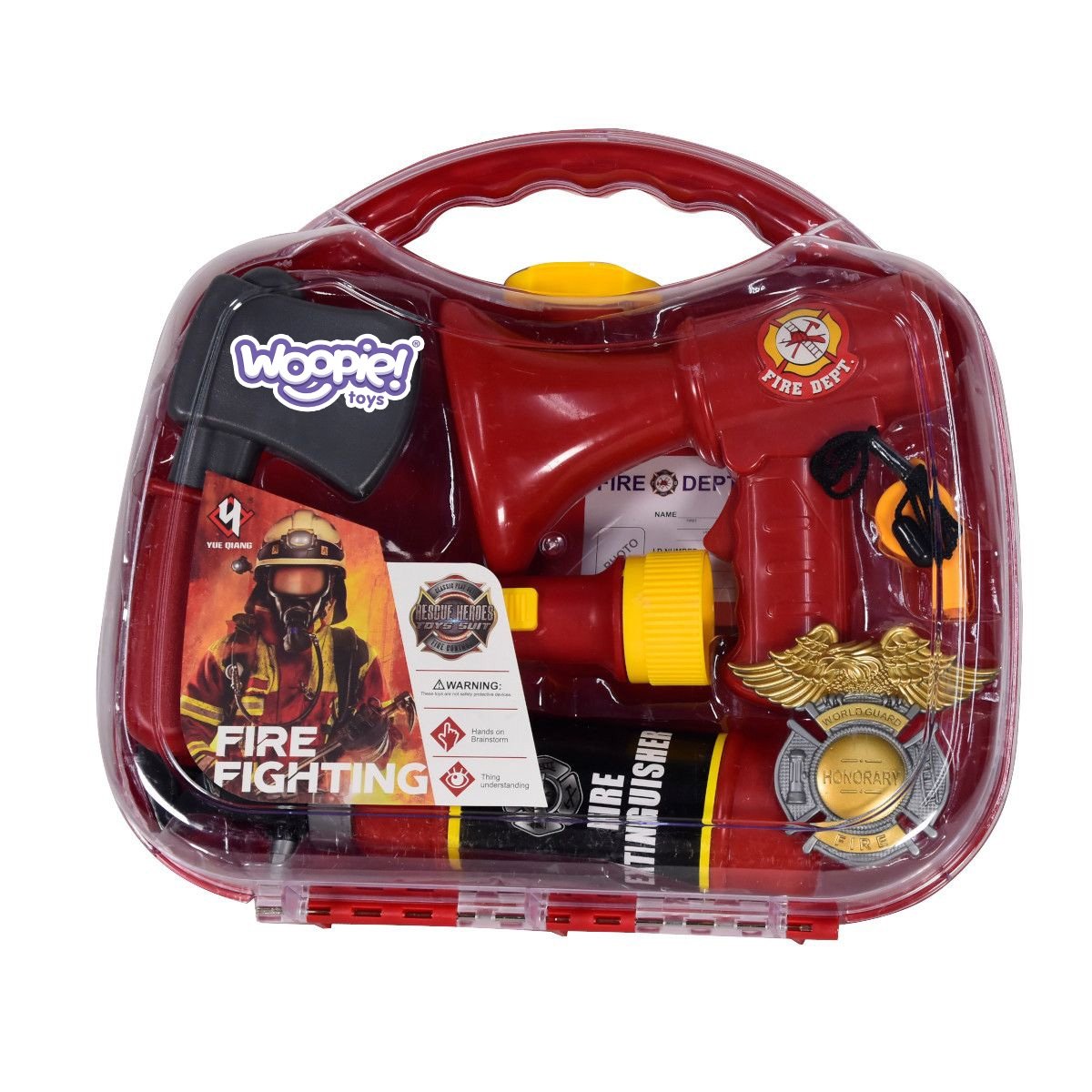 Mali vatrogasni kovčeg brenda WOOPIE san je svakog ljubitelja vatrogastva! Set uključuje sve potrebne dodatke koji će vašem djetetu omogućiti da postane pravi vatrogasac, kao što su: aparat za gašenje požara, megafon, bedž i mnogi drugi. Ovaj visoko profesionalni set reprodukcija je prave opreme . Aparat za gašenje požara raspršuje pravu vodu , baterijska svjetiljka svijetli, a megafon zasvira vatrogasna sirena . Dijete može dopuniti iskaznicu svojim imenom kako bi se osjećalo kao pravi vatrogasac . Elementi su savršeno prilagođeni dječjim rukama. Igre igranja uloga pozitivno razvijaju dijete – razvijaju maštu i kreativnost te svijest o svakodnevnom životu.