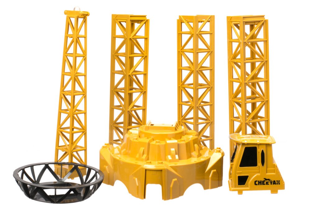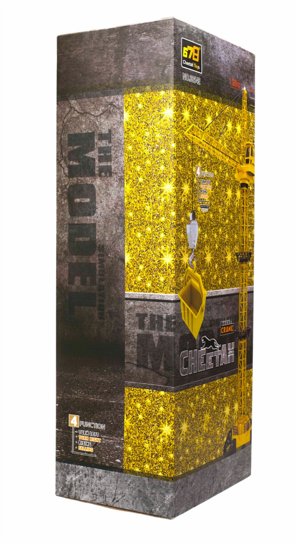 Žuto-crni kran daljinski upravljan daljinskim upravljačem koji je uključen u set.