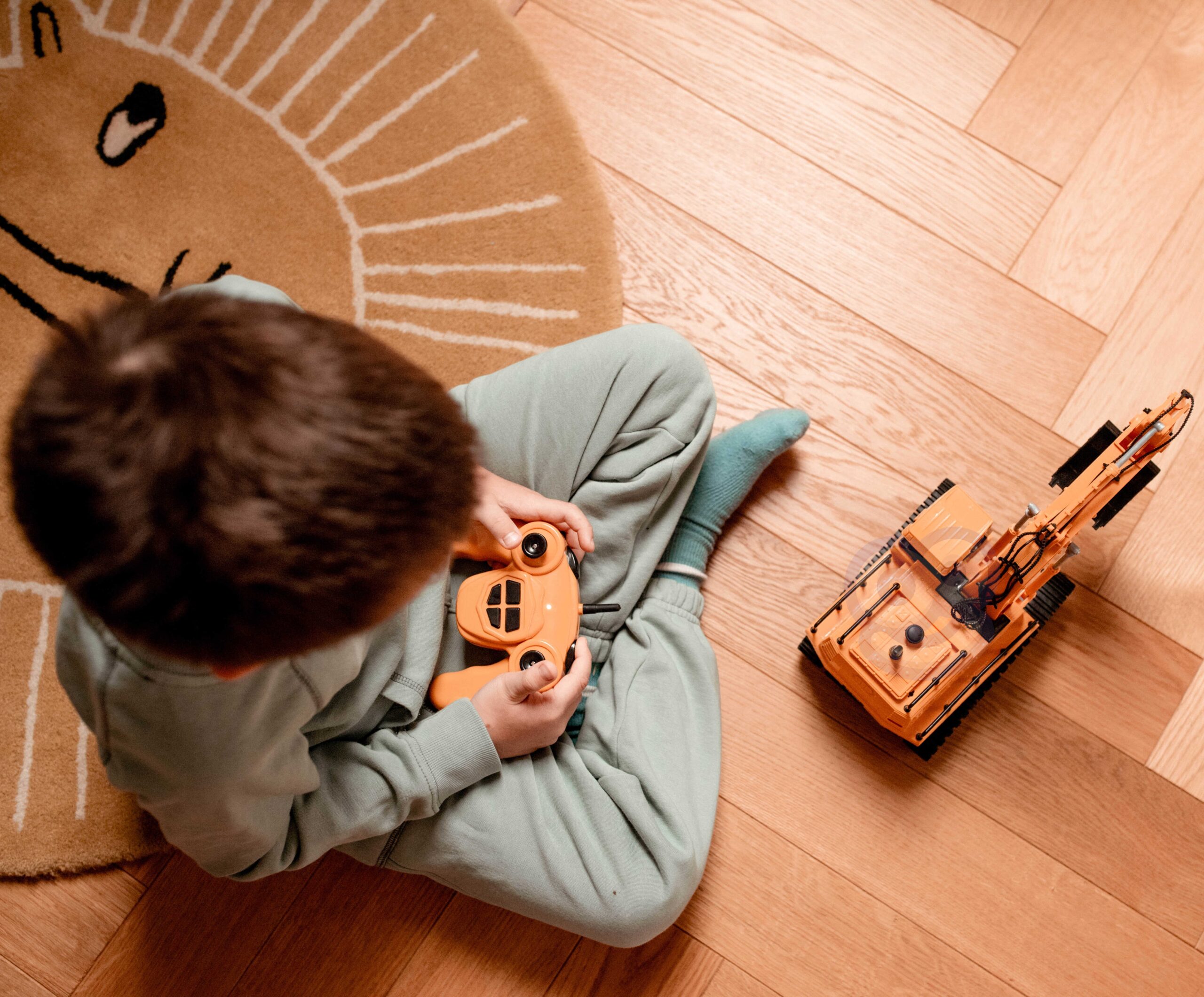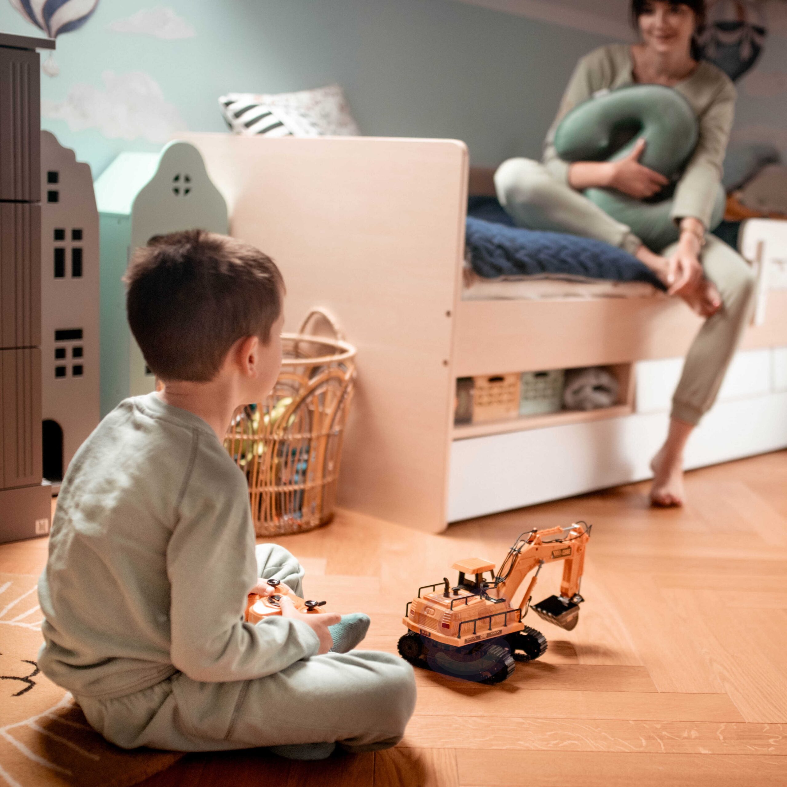 WOOPIE bager na daljinsko upravljanje savršena je igračka za svakog malog ljubitelja građevinskih strojeva. Vozilo je izrađeno od visokokvalitetnog materijala i ima široke gumene gusjenice zahvaljujući kojima se igračka može snaći i na najzahtjevnijim terenima. Štoviše, neće ogrebati pod kada igrate kod kuće . Izrađen s pažnjom na najsitnije detalje, savršena je imitacija pravog stroja u mjerilu 1:24 . Pretvorite dječju sobu u pravo gradilište. Vozilo odlikuje iznimna točnost, a svaki detalj je dotjeran . U kabini se nalazi volan i sve poluge potrebne za upravljanje strojem. Dodatno, izuzetno intenzivne boje čine igračku izražajnom . Bager ima čvrste gumene gusjenice. Daljinski upravljač s frekvencijom od 2,4 GHz definitivno razlikuje igračku od ostalih. Vozilo ima izvrsnu obrazovnu ulogu. Ovo je izvrstan način zabave u grupi – s roditeljima ili vršnjacima. U kompletu su i 2 znaka upozorenja i 2 čunja koji će djetetu omogućiti označavanje teritorija i igru učiniti atraktivnijom.