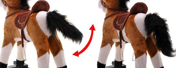 Na desnom i lijevom uhu konj ima gumbe koji pokreću kada dodirnete zvukove njištanja, galopa, konj počinje micati ustima, maše repom za još veću zabavu tijekom igre!