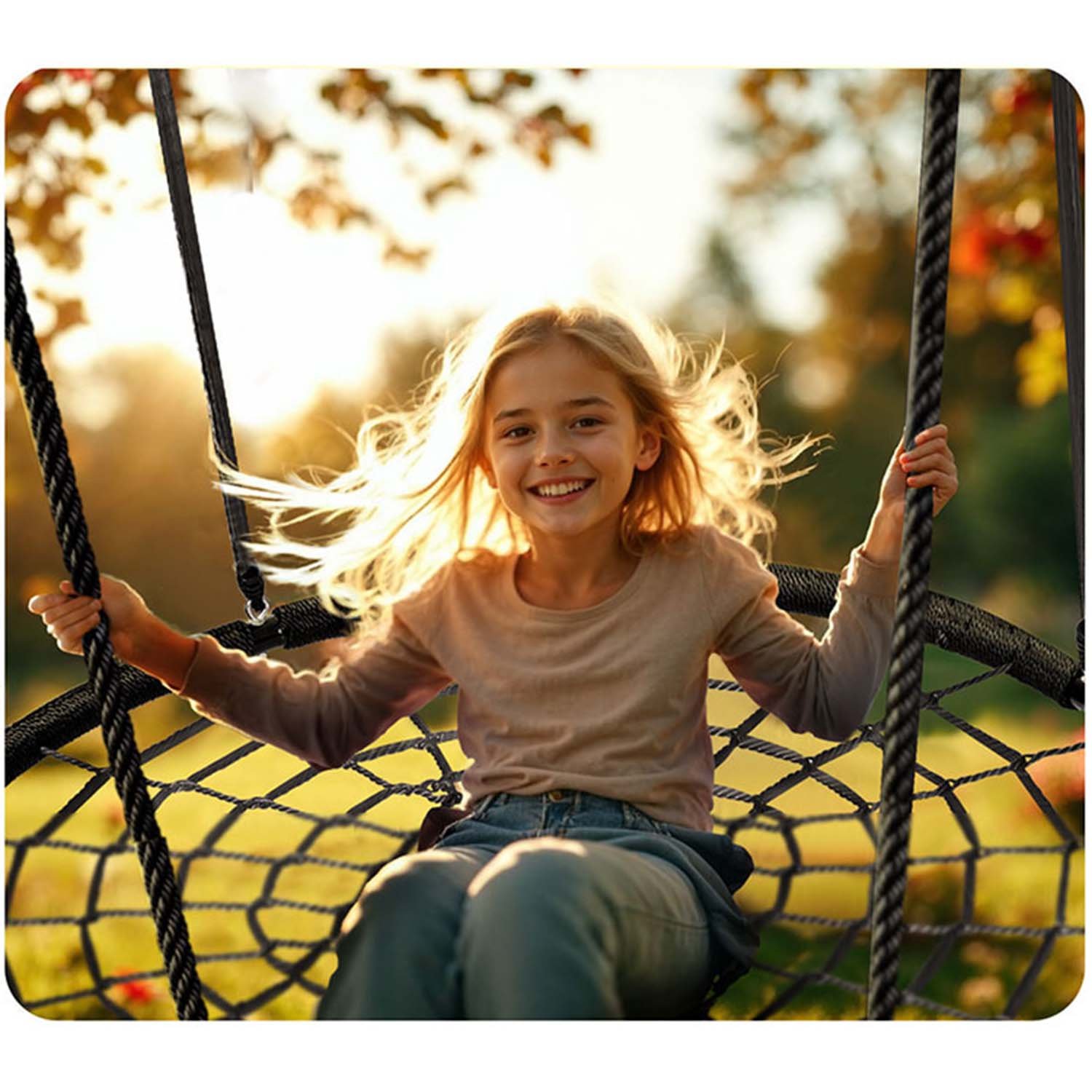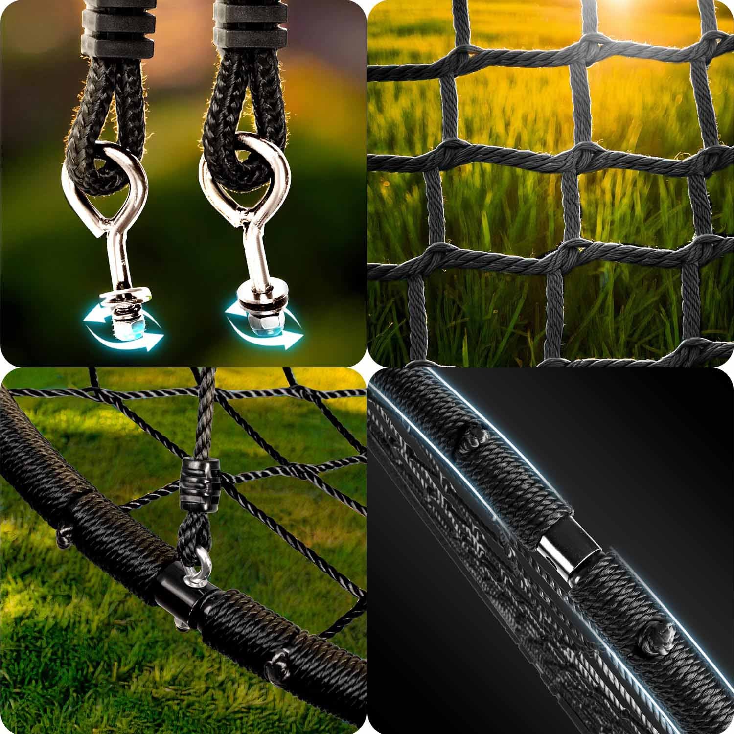 Ljuljačka na čeličnom okviru presvučenom zaštitnom pletenicom, izrađenom od jakog užeta paukovog tkanja i debelih užadi za ovjes. Pruža sigurnost, stabilnost i trajnost.
