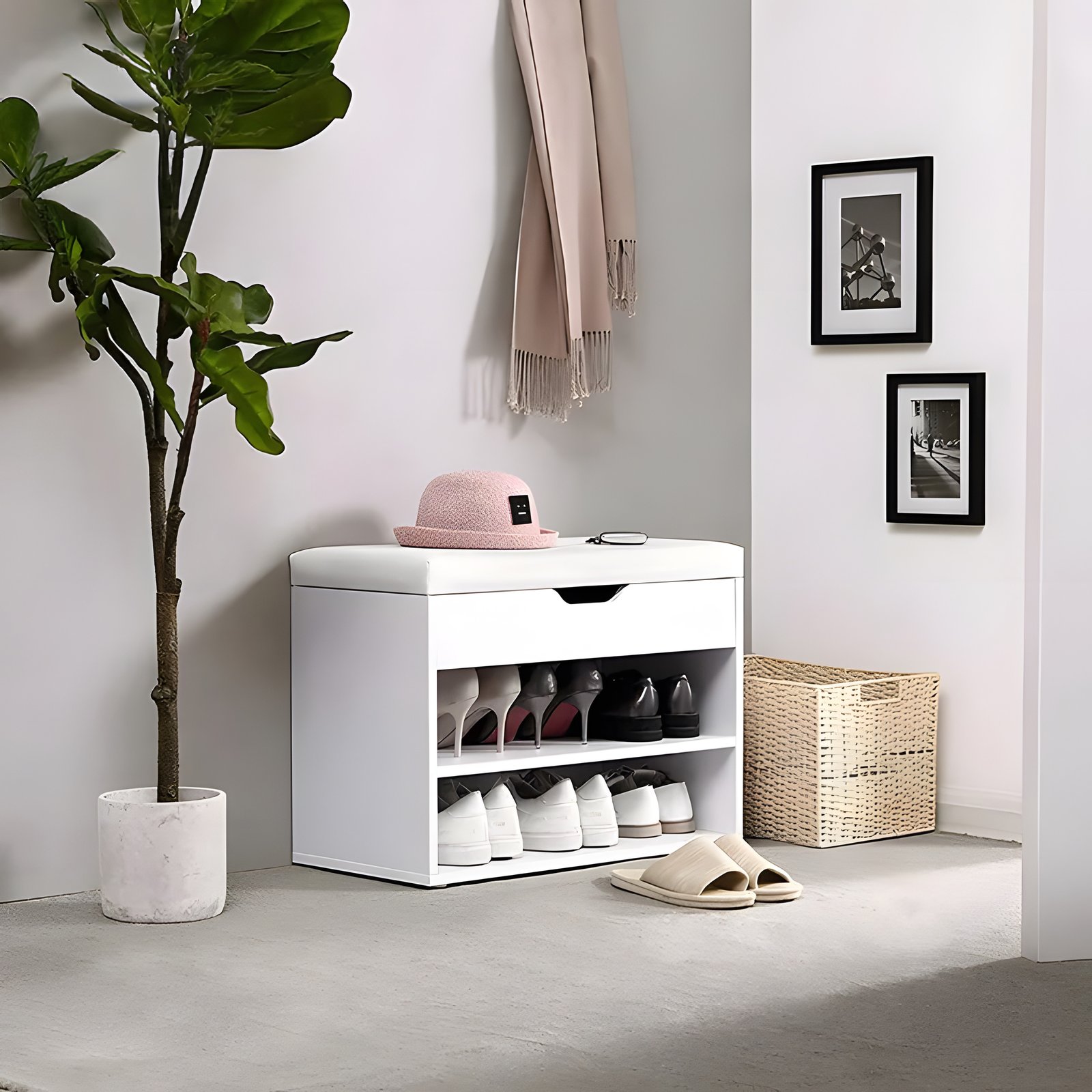 Ormarić je opremljen s dvije prostrane police, koje pružaju dovoljno prostora za spremanje cipela. Srednja polica se može montirati na 3 različite visine (20, 17, 14 cm od donje police).Ispod sjedala postoji još jedan prostor, savršen za odlaganje papuča ili manjih odjevnih predmeta kao što su kape, šalovi ili rukavice.