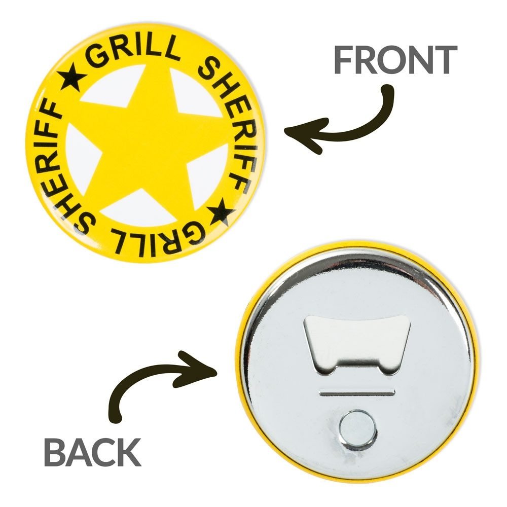 Set uključuje pregaču za roštilj i otvarač za boce s magnetom. Na pregaču se postavlja drugi magnet za pričvršćivanje otvarača za boce.