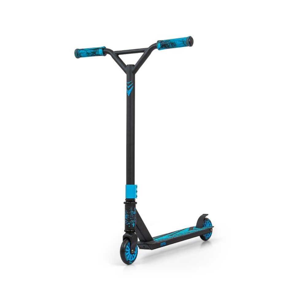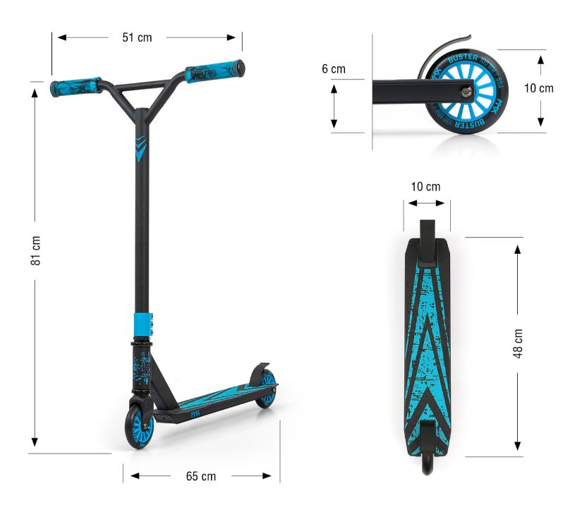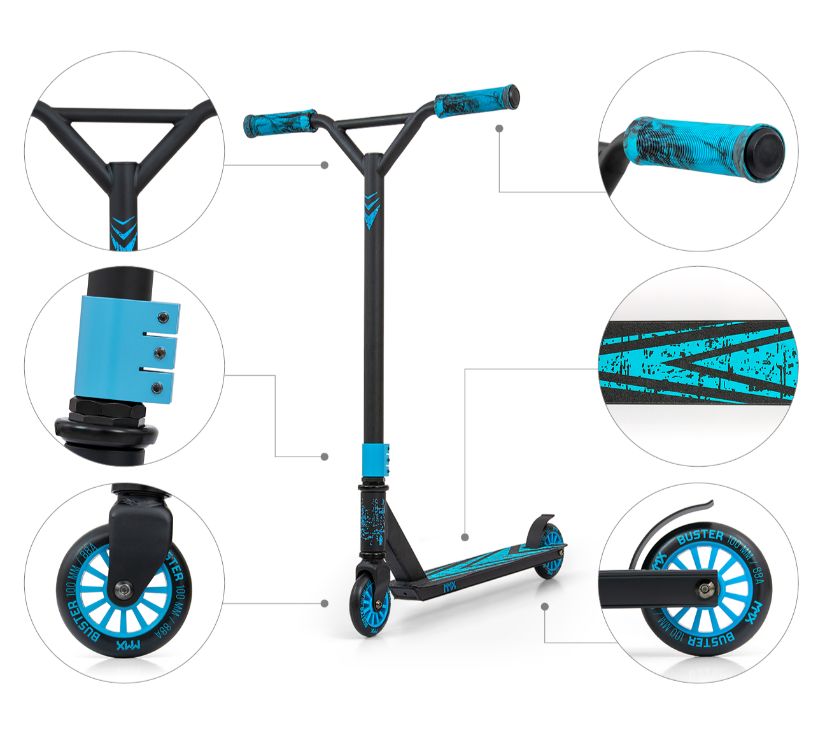 Romobil MMX Buster izrađen je od visokokvalitetnih materijala koji osiguravaju vrlo dobru razinu sigurnosti tijekom vožnje. Konstrukcija romobila kombinira aluminij i čelik, zahvaljujući čemu imamo malu težinu uz odgovarajuću stabilnost. Romobil MMX Buster optimalna je oprema za početnike za učenje trikova i igranje na skuteru. Platforma za skuter izrađena je od aluminija, presvučena je neklizajućom površinom i završava stražnjom kočnicom “FLEX BREAK”.