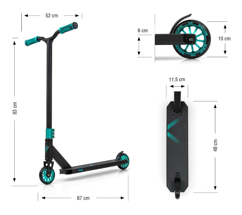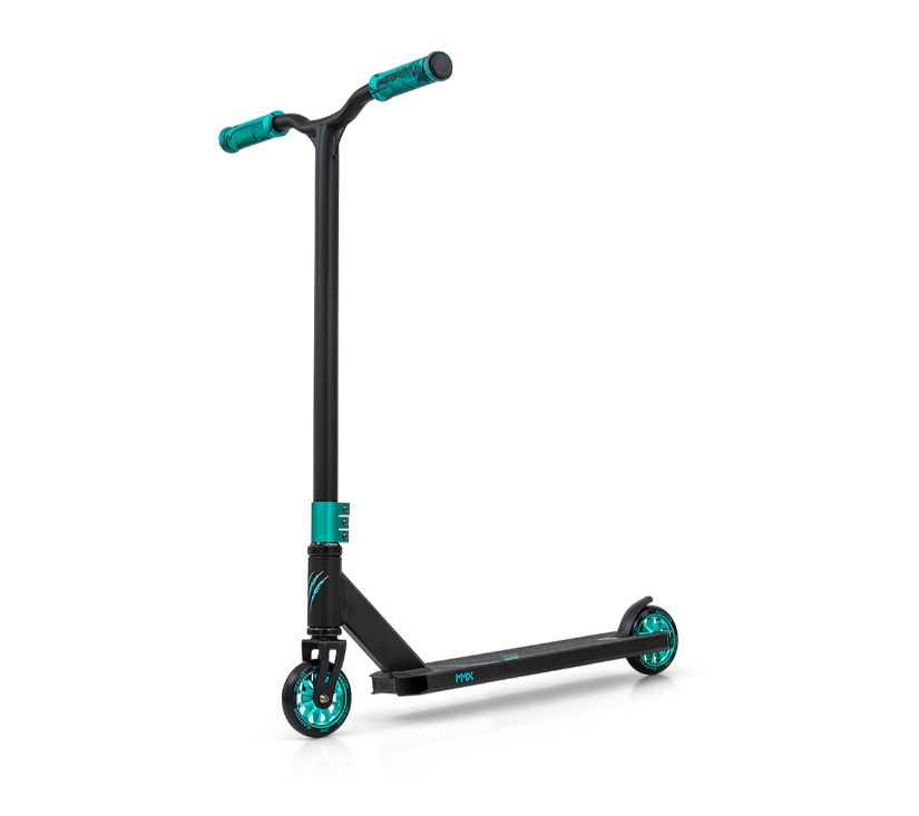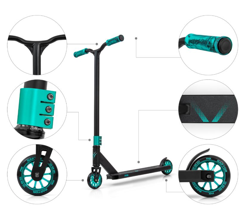 Romobil MMX Raptor izrađen je od visokokvalitetnih materijala koji osiguravaju vrlo dobru razinu sigurnosti tijekom vožnje. Konstrukcija romobila kombinira aluminij i čelik, zahvaljujući čemu imamo malu težinu uz odgovarajuću stabilnost. Romobil MMX Raptor optimalna je oprema za početnike za učenje trikova i igranje na skuteru. Platforma za skuter izrađena je od aluminija, presvučena je neklizajućom površinom i završava stražnjom kočnicom “FLEX BREAK”.