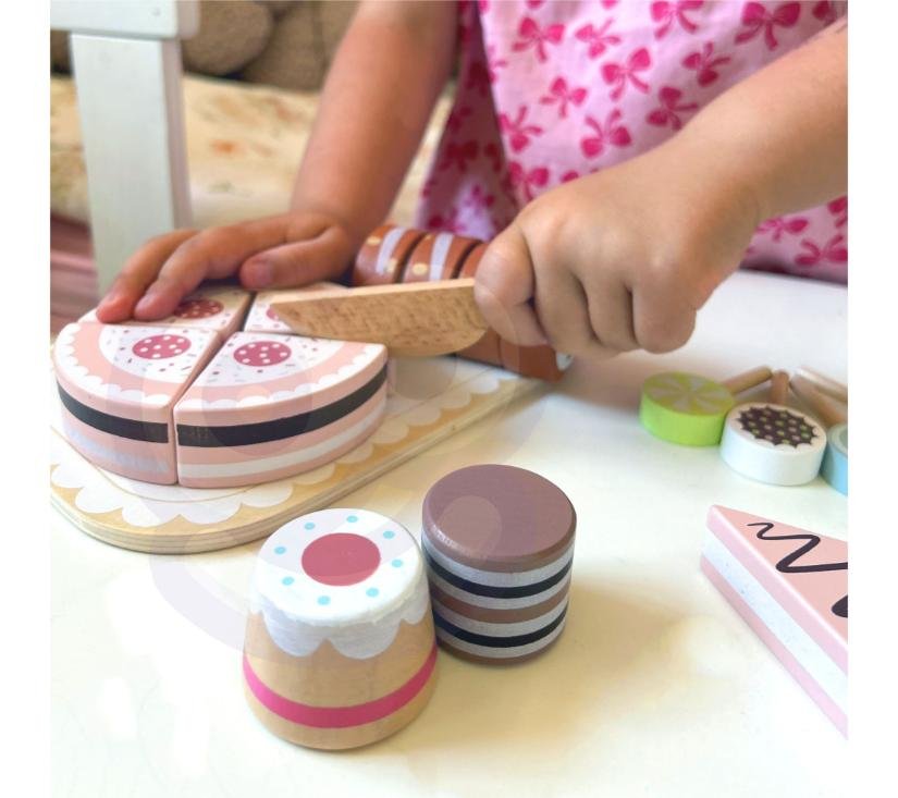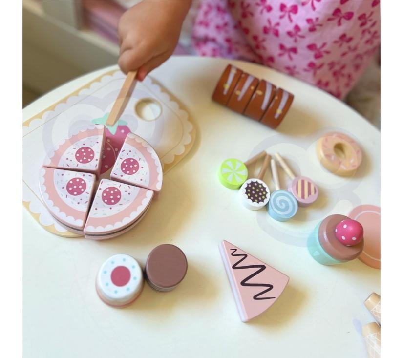 Sweet Cake je drveni set slatkiša tvrtke Tooky Toy , savršen za kreativnu zabavu tijekom zabava. Sadržaj ove plastične kutije uključuje prekrasan kolač i roladu koja se može rezati, dvije ljupke šalice za čaj, kolačiće, krafne, sladoled, lizalice i elegantan pladanj za posluživanje ovih delicija. Ova sveobuhvatna oprema omogućuje organiziranje formalne rođendanske zabave ili drugog posebnog sastanka s prijateljima. Igra sa Sweet Cakeom ne samo da razvija djetetovu maštu , već također podržava razvoj manuelnih vještina . Pomoću ovog seta djeca mogu biti u ulozi malih slastičara i uživati stvarajući nezaboravne trenutke tijekom susreta.