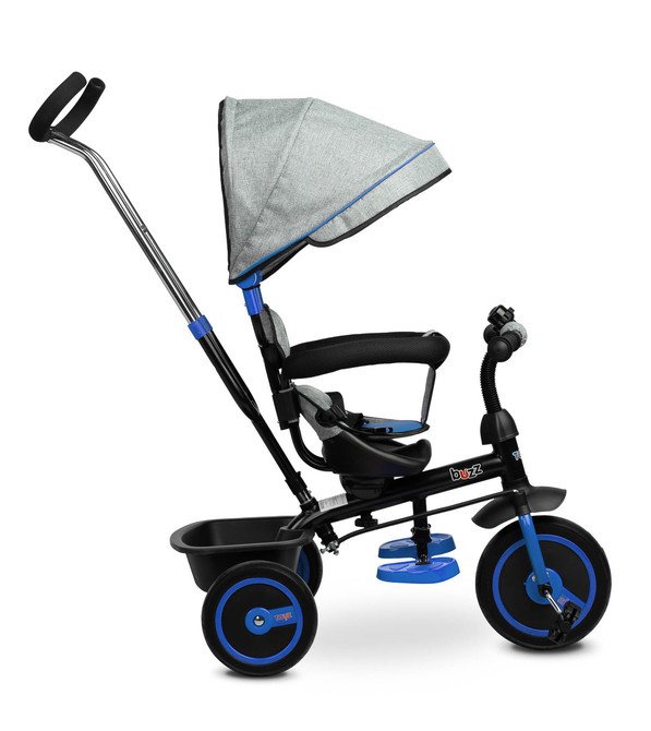 Bicikl BUZZ jedno je od naših brojnih inovativnih rješenja koje kombinira tricikl s kolicima. Bicikl je opremljen pojasevima i prostranom, sklopivom nadstrešnicom koja štiti dijete od sunca. U košaru koja se nalazi na stražnjoj strani možete staviti razne sitnice i igračke za malo dijete ili torbu za kupovinu. Bicikl ima 3-stupanjsko podešavanje visine oslonca za noge i slobodni hod. Za roditelje je pogodnost podesiva visina ručke.