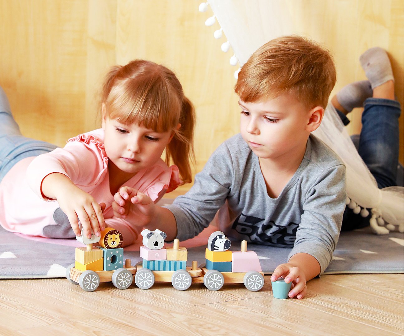 S 3 drvena vagona vlakova i 15 blokova nježnih boja jedinstvenih oblika, djeca mogu sastavljati dijelove i sastavljati vlakove ograničene samo njihovom maštom. Dok ih slažu i preuređuju, mališani od 18 mjeseci i više izoštrit će motoričke vještine, koordinaciju oko-ruka i spretnost.