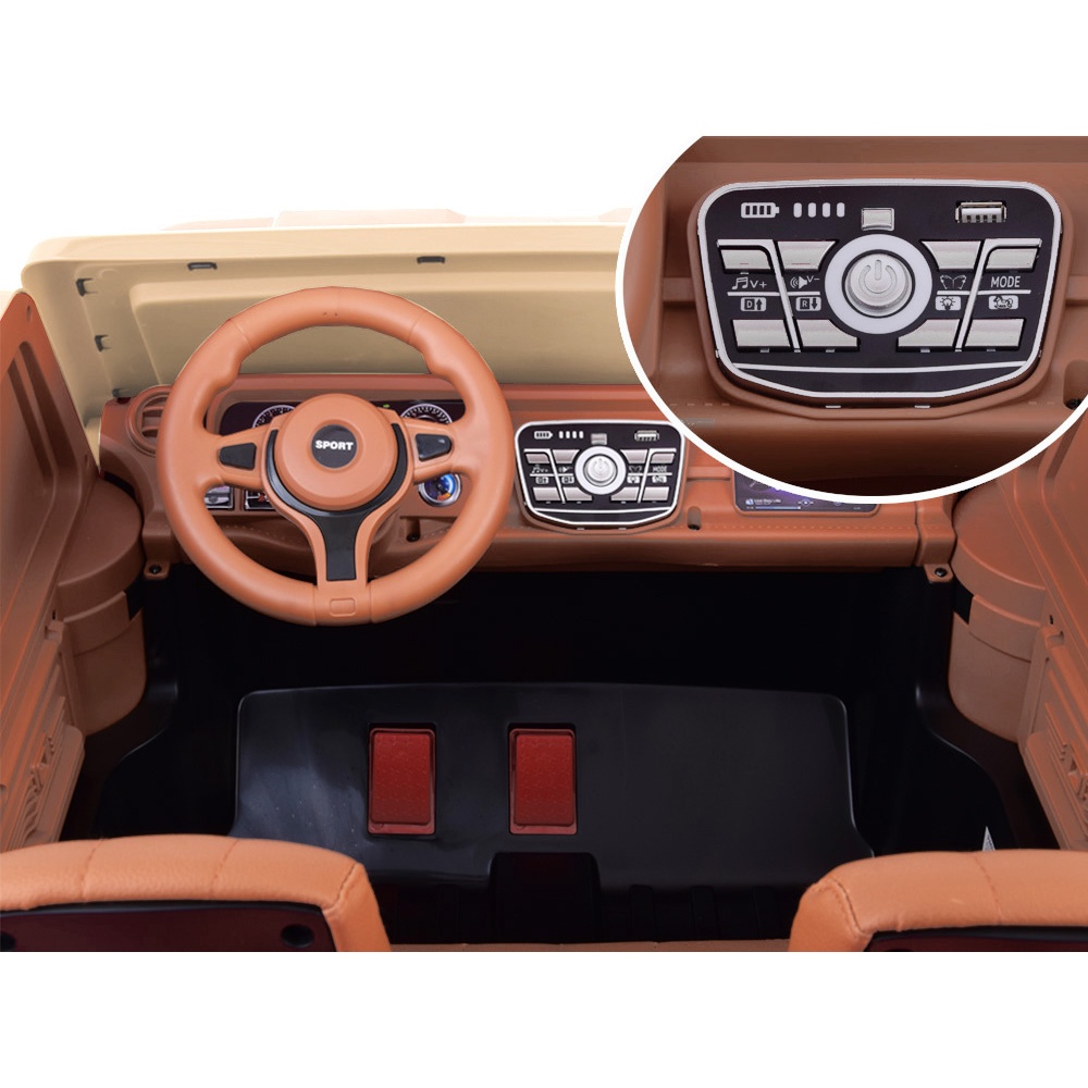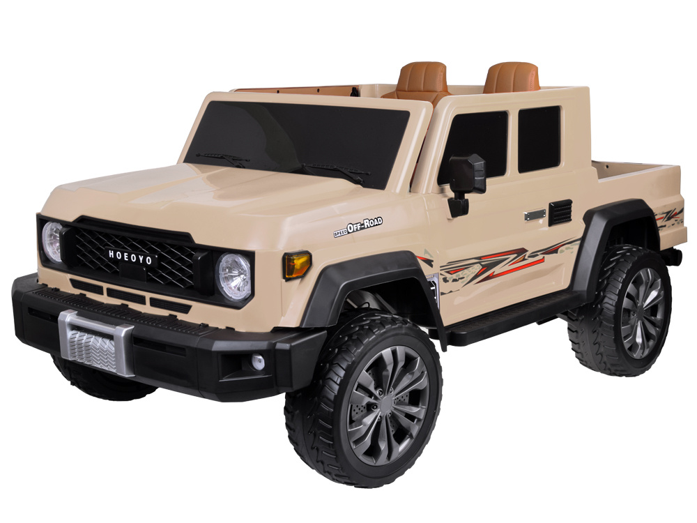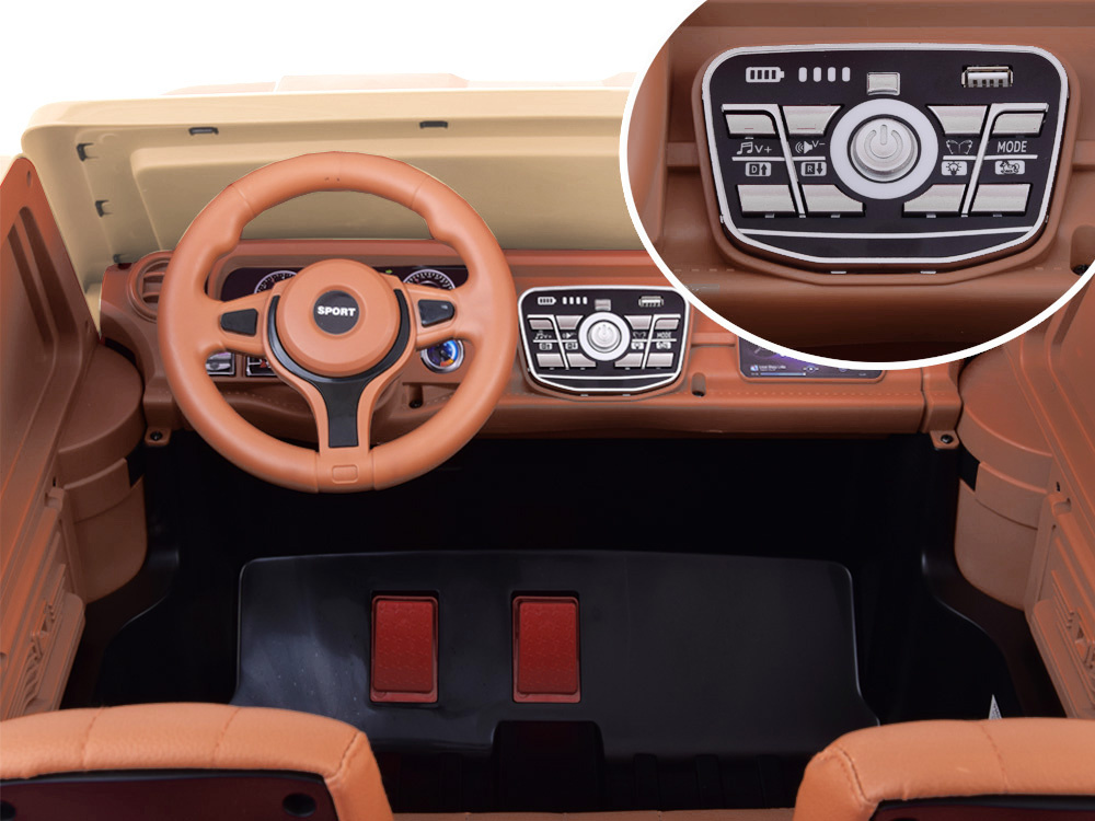 Automobil ima otvarajuća vrata koja olakšavaju ulazak i izlazak iz vozila. Unutra ćemo pronaći udobno sjedalo s navlakom od eko kože. Sjedalo je opremljeno sigurnosnim pojasom za krilo. Udobnost vožnje osiguravaju mekani kotači od EVA pjene i amortizeri na stražnjoj osovini. Automobil ima sporo pokretanje, što je posebno važno za manje dijete. Vozilo glatko kreće nakon pritiska na papučicu gasa. Automobil je opremljen električnom kočnicom koja radi nakon otpuštanja noge s papučice gasa i papučicom kočnice koja zaustavlja vožnju. Zahvaljujući tome, dijete se može osjećati kao da je u pravom automobilu! Straga ćemo pronaći prostranu teretnu kutiju s preklopom koji se spušta, idealnu za prijevoz raznih sitnica potrebnih tijekom igre. Kutija je savršena za prijevoz plišanih medvjedića i lutke, a zahvaljujući njoj uvijek možete imati svoje omiljene grickalice i pića pri ruci.