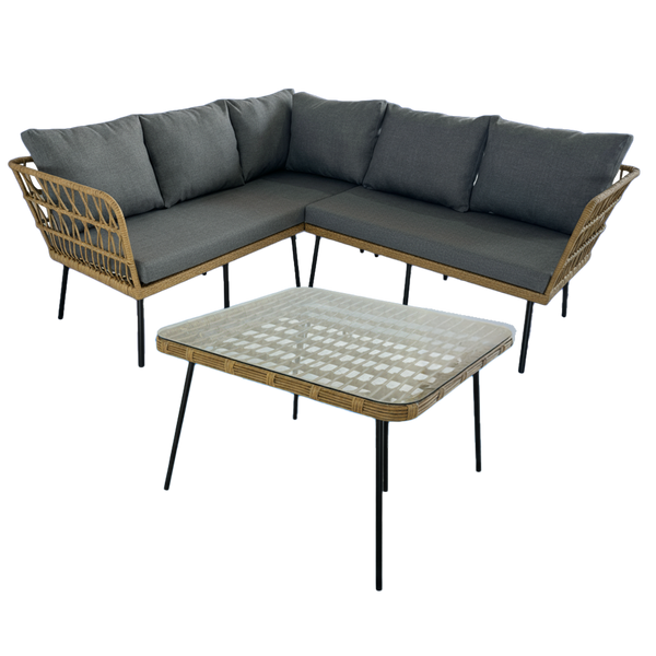 – savršeno za vrt, terasu, balkon ili verandu. Set uključuje kutnu sofu i funkcionalni stol sa staklenom pločom. Cijeli set izrađen je od izdržljivih materijala koji jamče dugotrajnost i otpornost na vremenske uvjete.