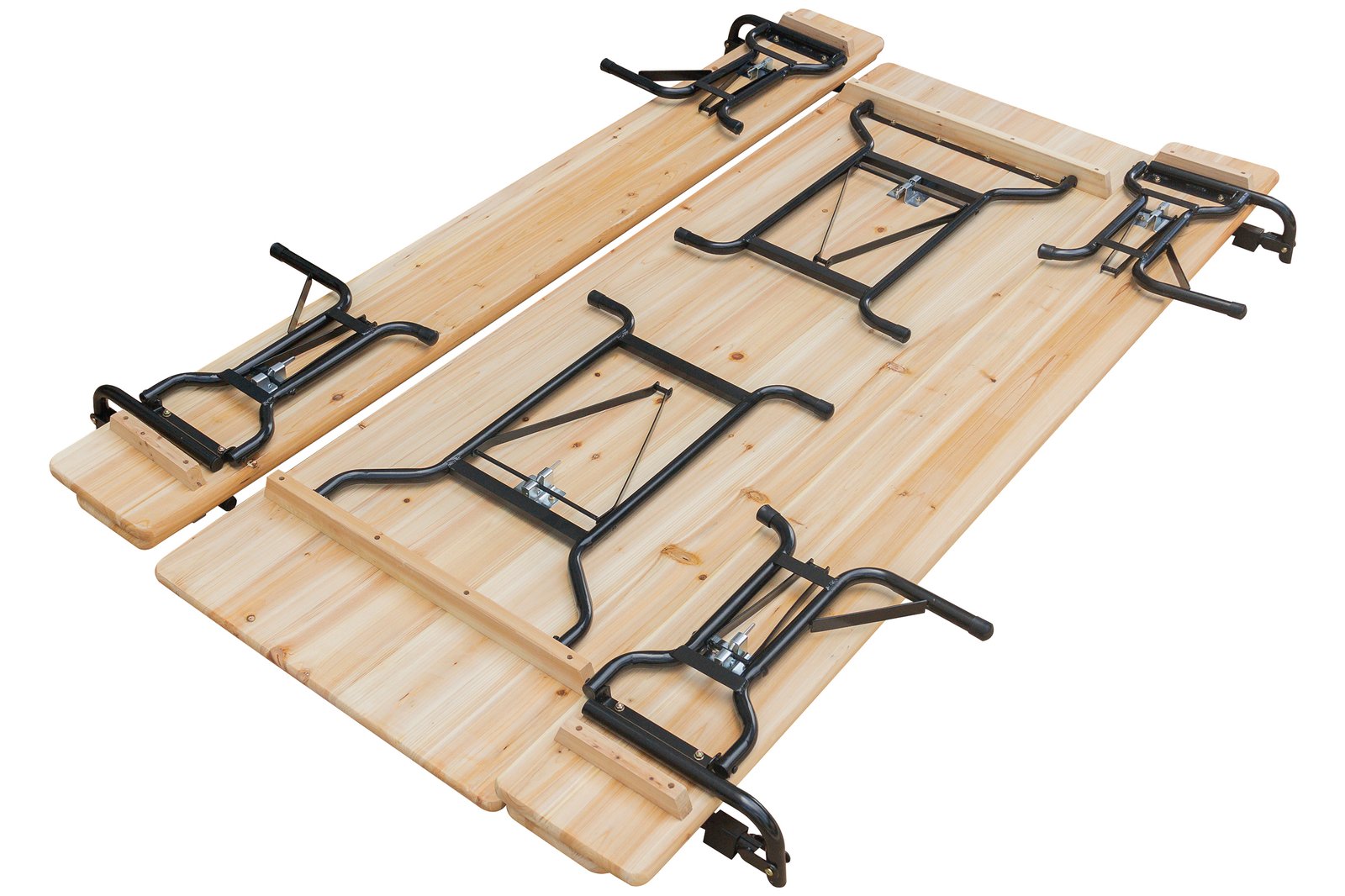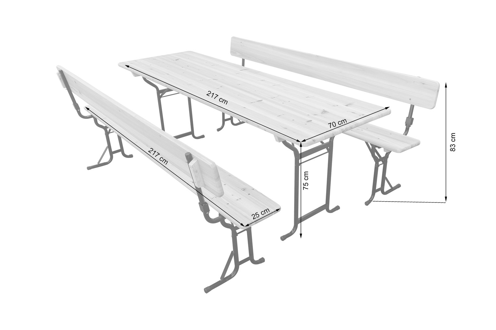Ovaj set pivskih stolova s naslonima praktično je i estetski ugodno rješenje za vanjske događaje, vrtove, barove ili restorane. Sklopivi dizajn olakšava pohranu i transport. Opremljen udobnim naslonima za dodatnu udobnost sjedenja, set se sastoji od stola i dvije klupe.